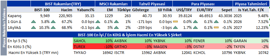 Dünya piyasalarının seyri Borsa İstanbul’da yatay bir açılışa işaret ediyor. %10’luk yükseliş sonrası bankaların seyri piyasanın yönünü belirlemekte etkili olacak. Piyasa hakkında olumlu görüşümüzü koruyoruz. Dünkü sert yükselişe rağmen MSCI Türkiye son 12 ayda %23 kayıp ile en çok kaybettiren gelişmekte olan ülke endeksi. Sene başından beri ise %8 kayıpla, Tayland’ın arkasından en kötü ikinci piyasayız. Değerlemelerimiz halen makul seviyelerde. İzmir belediyesi ile ilgili soruşturma nedeniyle bugün bir kar satışı ile karşılaşabiliriz. Ancak, siyaset ile piyasa arasında bu denli güçlü bir ilişkiyi anlamlı bulmuyoruz. Bu anlamda dünkü yükselişte kantarın topuzunun kaçtığını söyleyebiliriz. Endeks için destek ve direnç seviyeleri 9.850 ve 10.100.