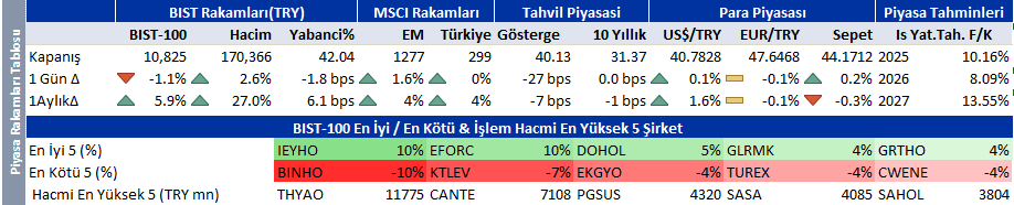 ABD, Avrupa vadelileri ve Asya piyasalarının seyri Borsa İstanbul’da pozitif bir açılışa işaret ediyor. Ancak son günlerdeki sert satış sonrası yatırımcılar tepkiye oynamak yerine görerek ilerlemeyi tercih edebilir. İkinci çeyrek sonuçlarını açıklayan BİM ve Koton’un pozitif tepki vermesini, sürpriz yapmayan Anadolu Grubu Holding ve Şok’un nötr tepki vermesini bekleriz. Bugün 22:30’da yapılacak Putin-Trump görüşmesi öncesi barış hisselerinde oynaklık yaşanabilir. Endeks için destek direnç seviyeleri 10.800 ve 10.870. Satış devam ederse ilk ciddi destek seviyesi 10.700.