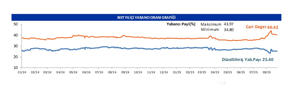 Borsanın yabancı payı günlük bazda 0.07 artışla 40.42 seviyesinde seyretmektedir.