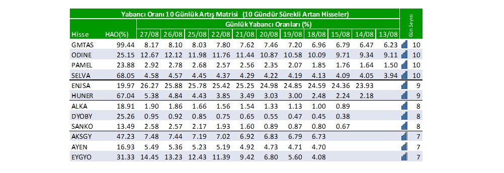 Son günlerde yabancı oranı sürekli artan hisselerden 5 tanesi; GMTAS:10 gün, ODINE:10 gün, PAMEL:10 gün, SELVA:10 gün, ENJSA:9 gündür yabancı oranları sürekli artış gösteriyor.
