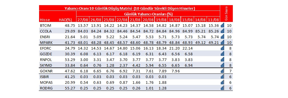 Son günlerde yabancı oranı sürekli düşen hisselerden 5 tanesi; BTCIM:10 gün, CCOLA:10 gün, ENSRI:10 gün, MPARK:10 gün, EFORC:8 gündür yabancı oranları sürekli düşüş gösteriyor.
