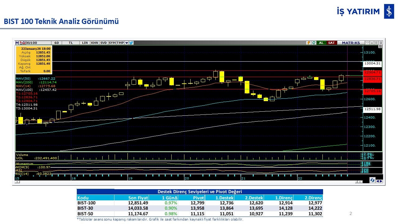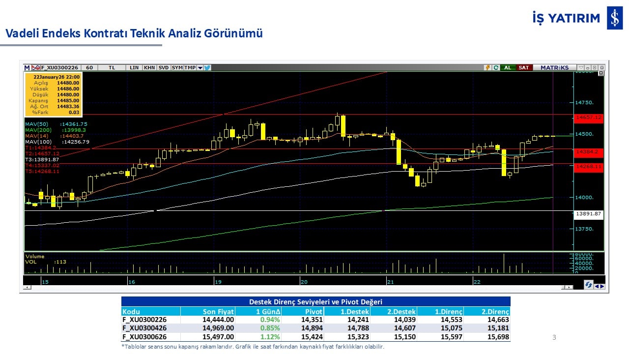 “Teknik Bülten” raporumuzun içeriğinde; Vadeli endeks, kur, BIST100 endeksi, temel analiz tarafında da öneri verdiğimiz 18 adet hissenin teknik destek/direnç seviyeleri ve buna baz teşkil eden teknik grafikleri, bugün piyasadan pozitif ayrışma ihtimali olan hisseler ve bunların teknik destek/direnç seviyeleri, piyasa rakamları, dün çok açığa satış yapılan hisse senetleri ve kısa vadeli işlem önerilerimizden son 10 tanesi yer almaktadır.