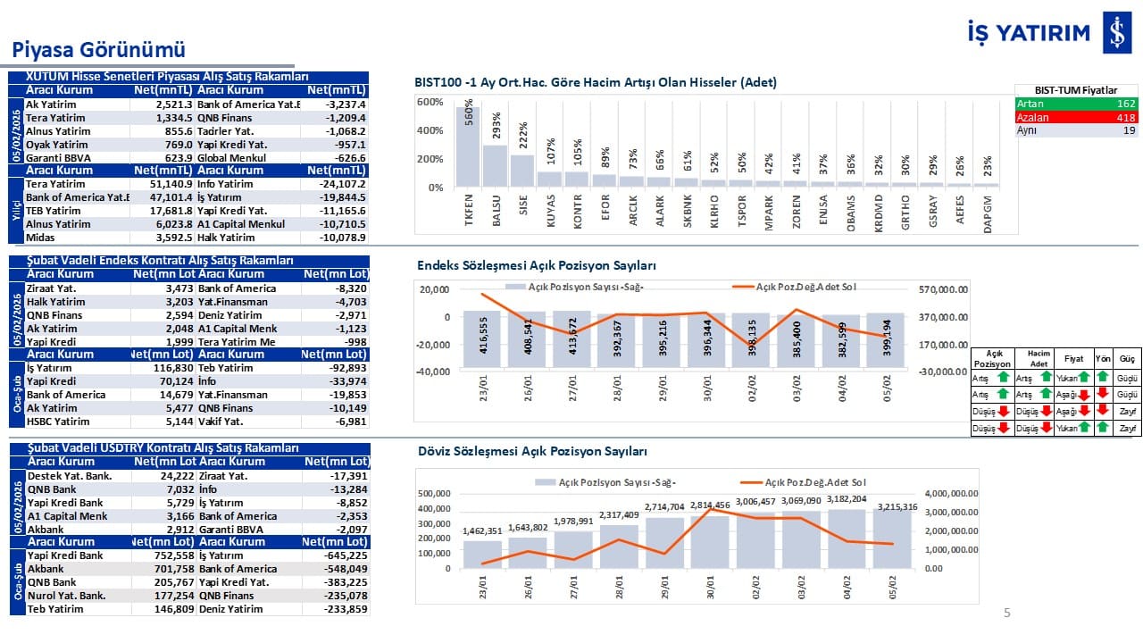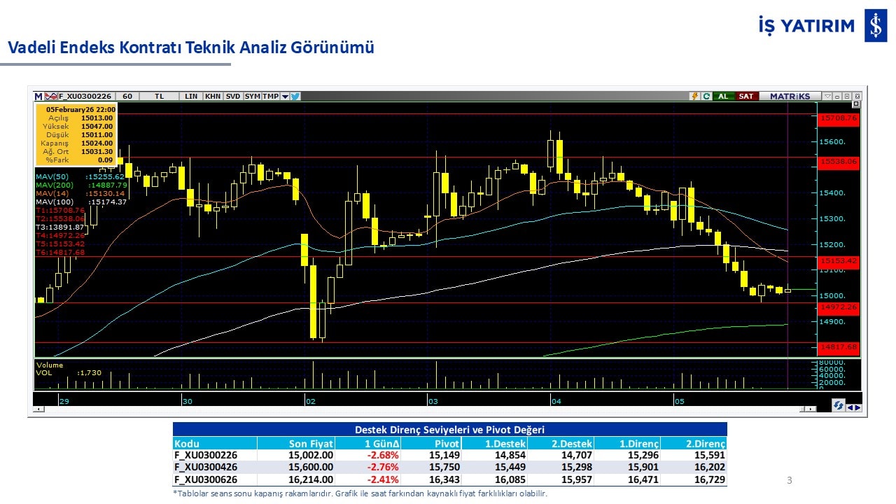 “Teknik Bülten” raporumuzun içeriğinde; Vadeli endeks, kur, BIST100 endeksi, temel analiz tarafında da öneri verdiğimiz 18 adet hissenin teknik destek/direnç seviyeleri ve buna baz teşkil eden teknik grafikleri, bugün piyasadan pozitif ayrışma ihtimali olan hisseler ve bunların teknik destek/direnç seviyeleri, piyasa rakamları, dün çok açığa satış yapılan hisse senetleri ve kısa vadeli işlem önerilerimizden son 10 tanesi yer almaktadır.