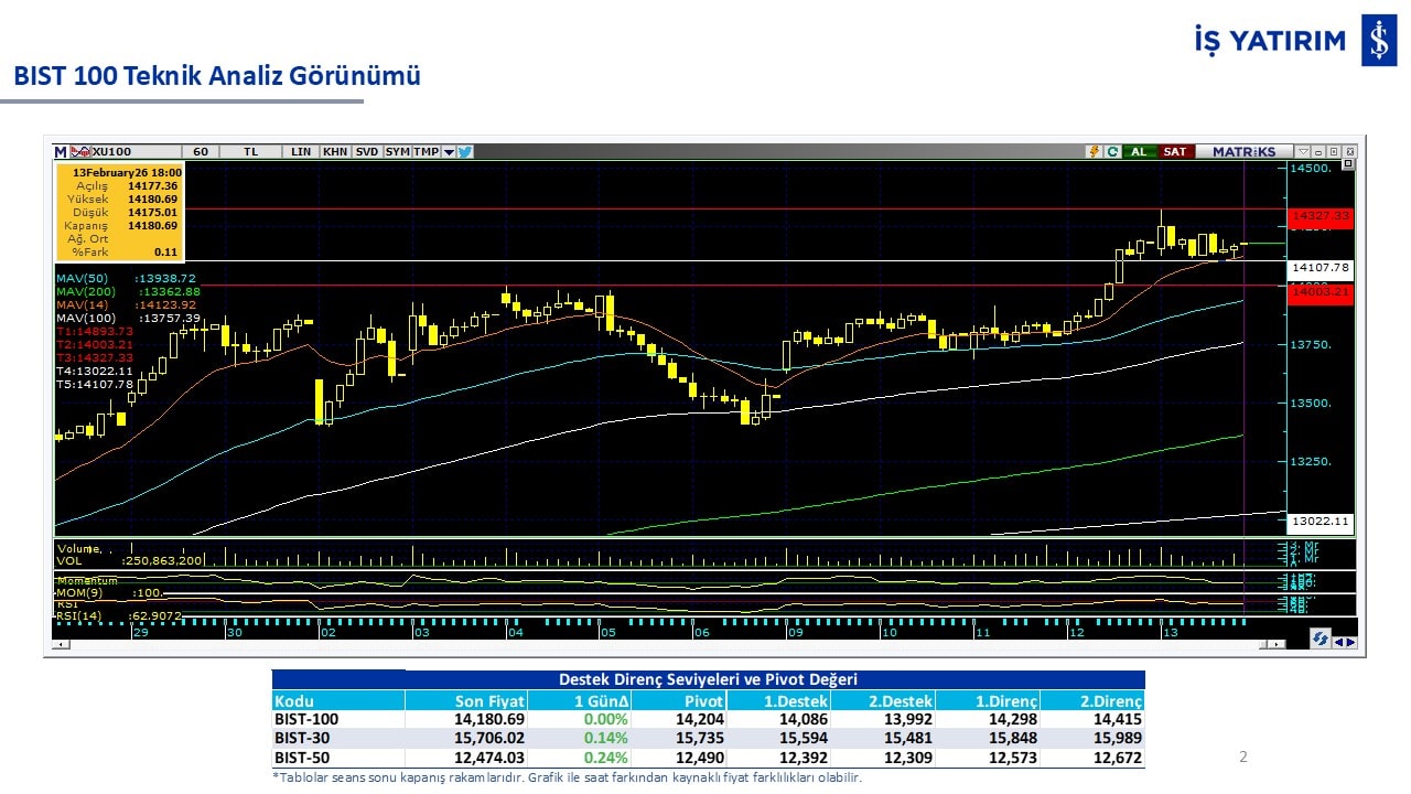 “Teknik Bülten” raporumuzun içeriğinde; Vadeli endeks, kur, BIST100 endeksi, temel analiz tarafında da öneri verdiğimiz 18 adet hissenin teknik destek/direnç seviyeleri ve buna baz teşkil eden teknik grafikleri, bugün piyasadan pozitif ayrışma ihtimali olan hisseler ve bunların teknik destek/direnç seviyeleri, piyasa rakamları, dün çok açığa satış yapılan hisse senetleri ve kısa vadeli işlem önerilerimizden son 10 tanesi yer almaktadır.