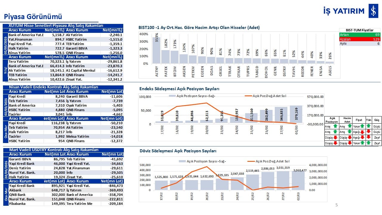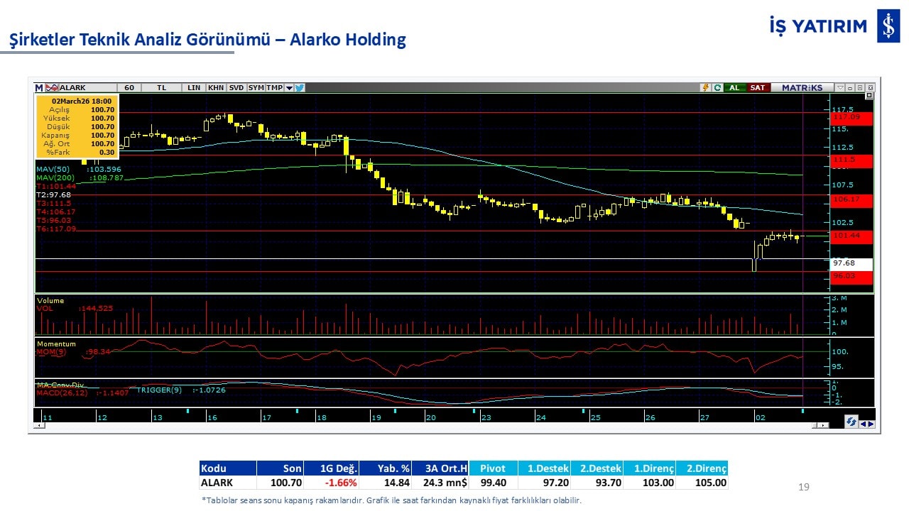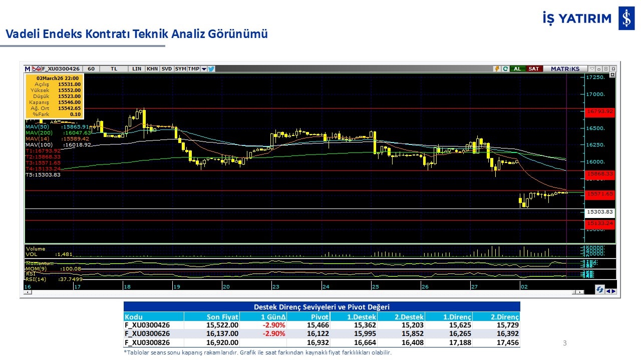 “Teknik Bülten” raporumuzun içeriğinde; Vadeli endeks, kur, BIST100 endeksi, temel analiz tarafında da öneri verdiğimiz 18 adet hissenin teknik destek/direnç seviyeleri ve buna baz teşkil eden teknik grafikleri, bugün piyasadan pozitif ayrışma ihtimali olan hisseler ve bunların teknik destek/direnç seviyeleri, piyasa rakamları, dün çok açığa satış yapılan hisse senetleri ve kısa vadeli işlem önerilerimizden son 10 tanesi yer almaktadır.
