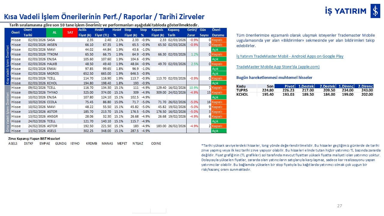Kısa vadeli işlemlerimizin performanslarını ve tarihi zirve kapanışı yapan BIST hisselerini raporun son bölümünde görüntüleyebilirsiniz.