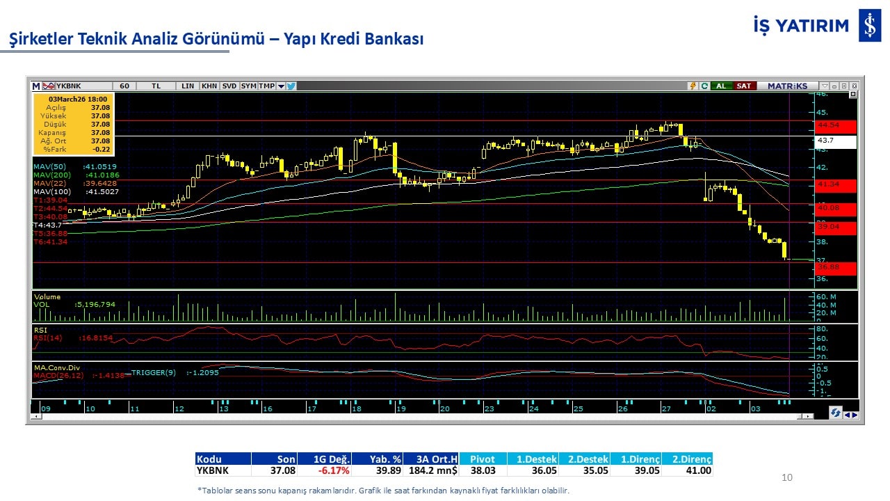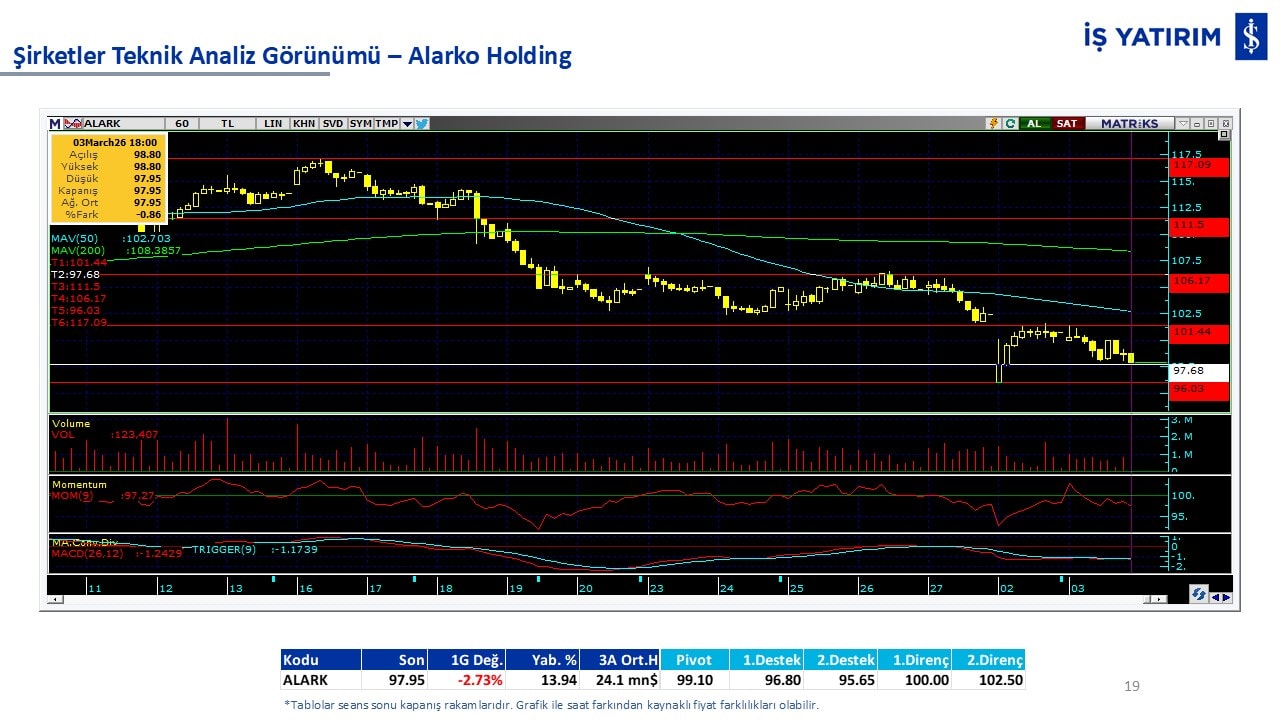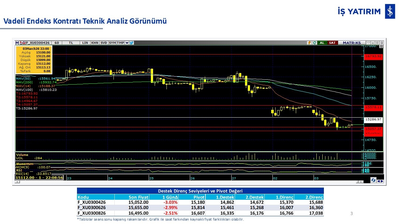 “Teknik Bülten” raporumuzun içeriğinde; Vadeli endeks, kur, BIST100 endeksi, temel analiz tarafında da öneri verdiğimiz 18 adet hissenin teknik destek/direnç seviyeleri ve buna baz teşkil eden teknik grafikleri, bugün piyasadan pozitif ayrışma ihtimali olan hisseler ve bunların teknik destek/direnç seviyeleri, piyasa rakamları, dün çok açığa satış yapılan hisse senetleri ve kısa vadeli işlem önerilerimizden son 10 tanesi yer almaktadır.