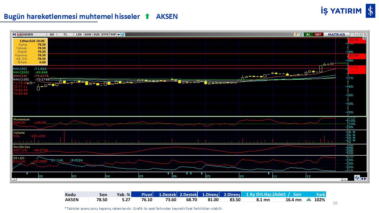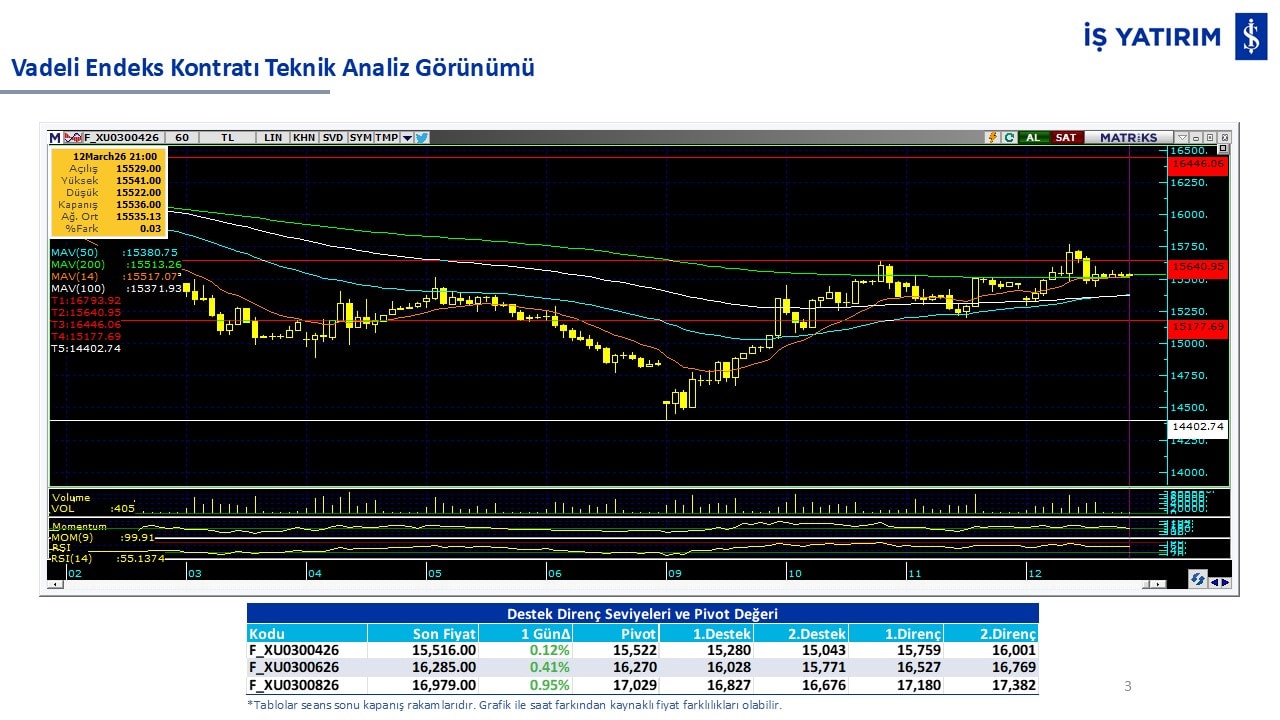 “Teknik Bülten” raporumuzun içeriğinde; Vadeli endeks, kur, BIST100 endeksi, temel analiz tarafında da öneri verdiğimiz 18 adet hissenin teknik destek/direnç seviyeleri ve buna baz teşkil eden teknik grafikleri, bugün piyasadan pozitif ayrışma ihtimali olan hisseler ve bunların teknik destek/direnç seviyeleri, piyasa rakamları, dün çok açığa satış yapılan hisse senetleri ve kısa vadeli işlem önerilerimizden son 10 tanesi yer almaktadır.