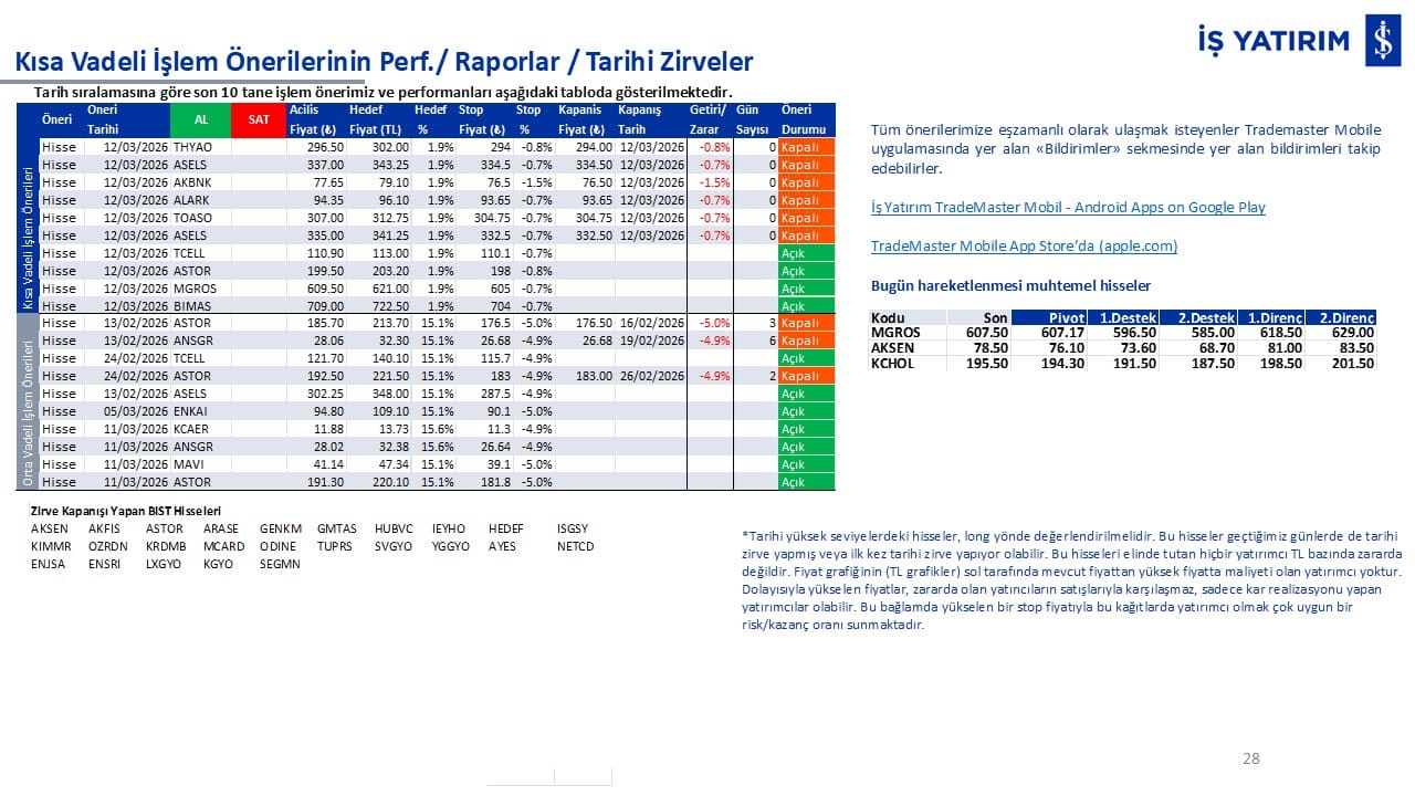 Kısa vadeli işlemlerimizin performanslarını ve tarihi zirve kapanışı yapan BIST hisselerini raporun son bölümünde görüntüleyebilirsiniz.