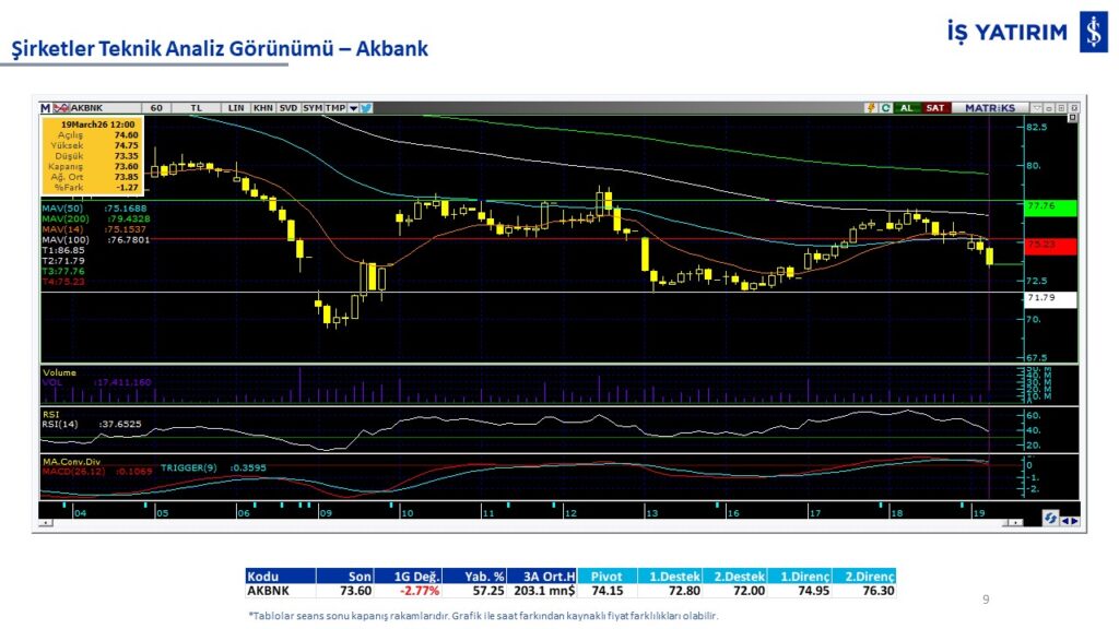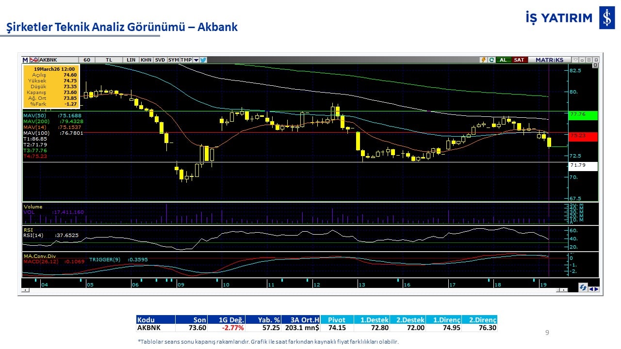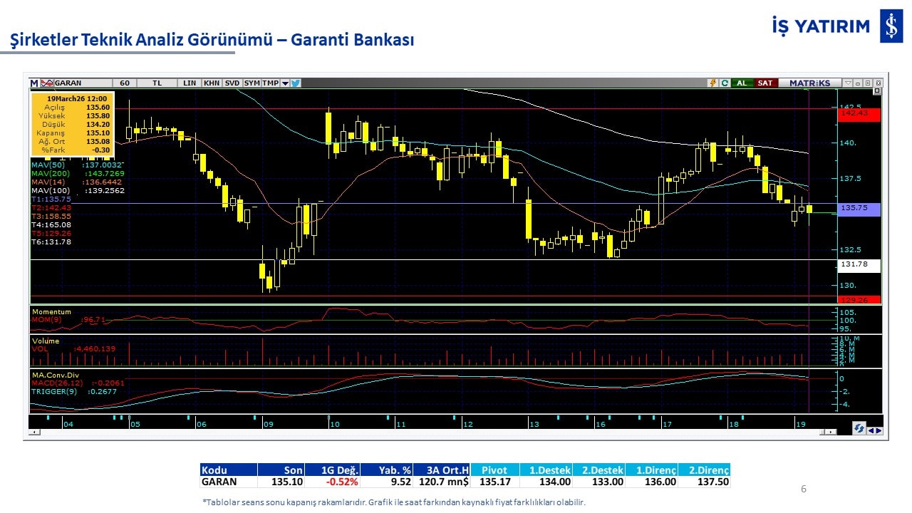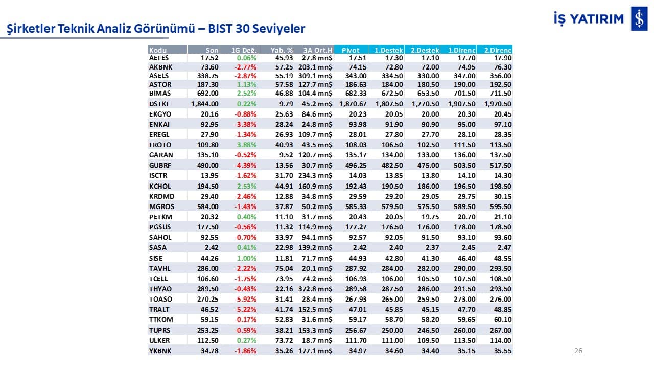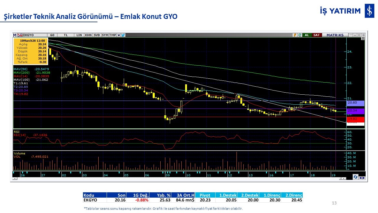Teknik analiz görünümü olan şirketler: GARAN, THYAO, ISCTR, AKBNK, YKBNK, VAKBN, HALKB, EKGYO, TCELL, ENKAI, KCHOL, MAVI, ARCLK, ALARK, SAHOL, AGHOL, SOKM, MPARK.