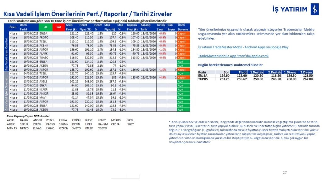 Kısa vadeli işlemlerimizin performanslarını ve tarihi zirve kapanışı yapan BIST hisselerini raporun son bölümünde görüntüleyebilirsiniz.