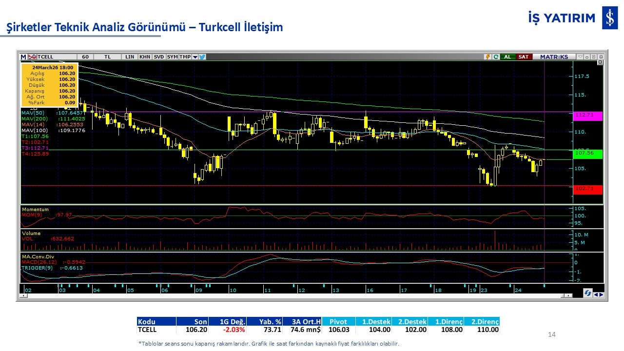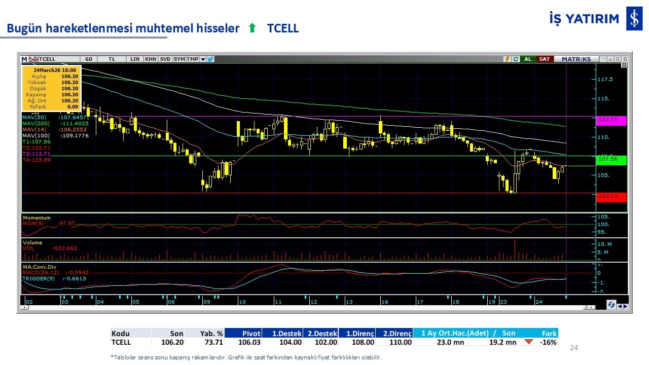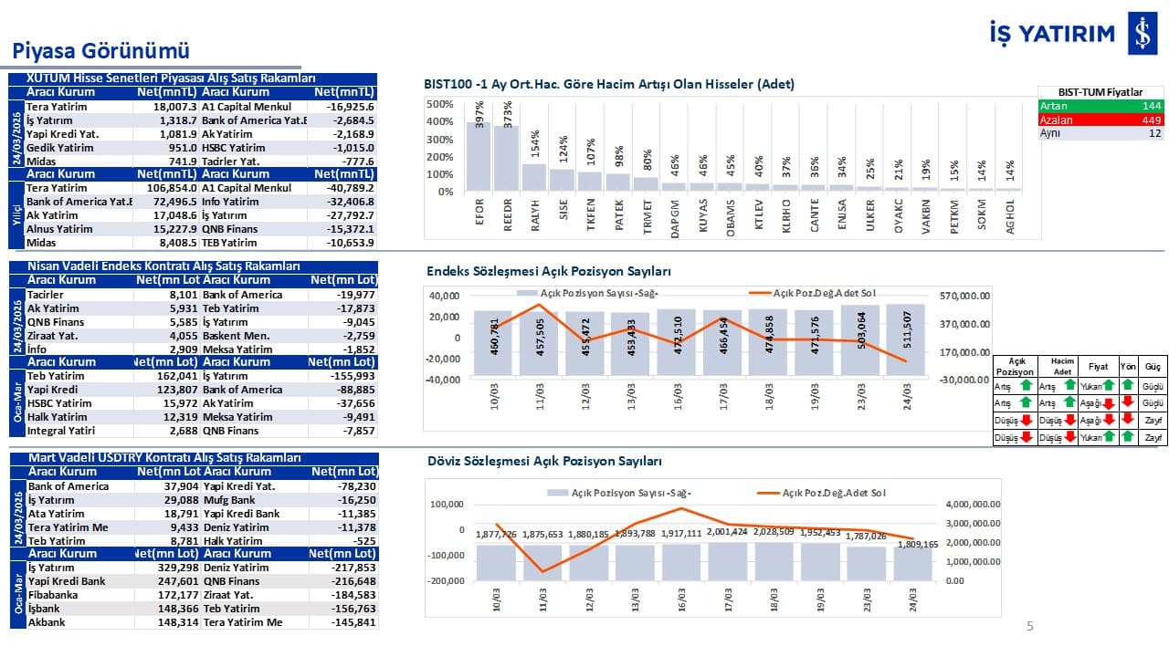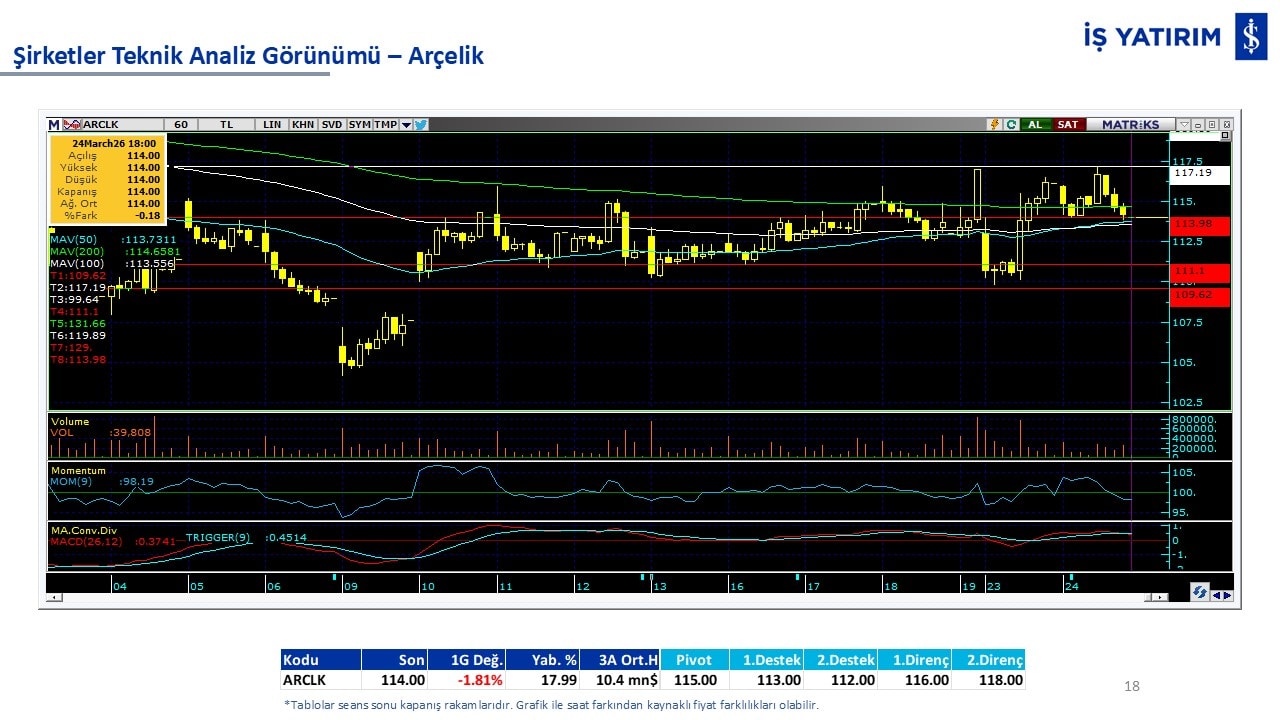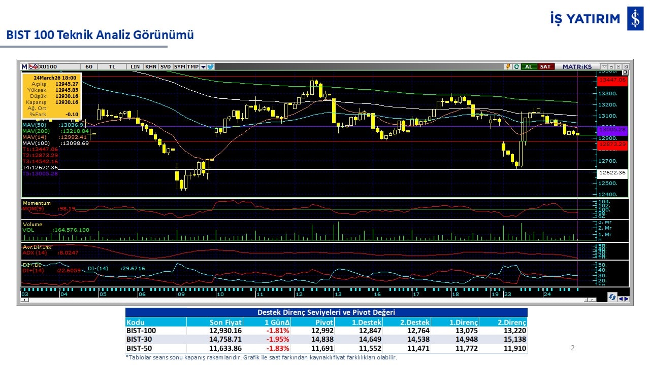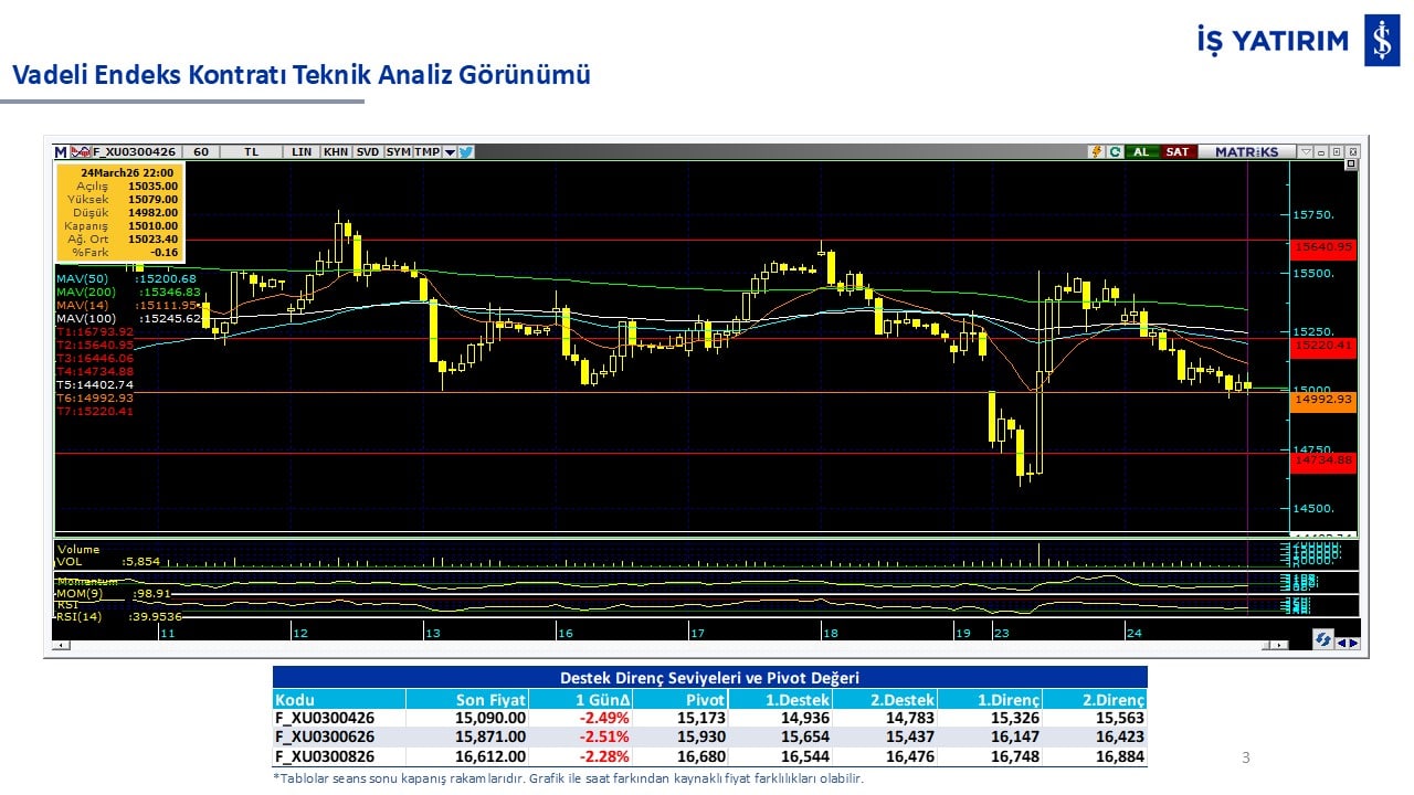 “Teknik Bülten” raporumuzun içeriğinde; Vadeli endeks, kur, BIST100 endeksi, temel analiz tarafında da öneri verdiğimiz 18 adet hissenin teknik destek/direnç seviyeleri ve buna baz teşkil eden teknik grafikleri, bugün piyasadan pozitif ayrışma ihtimali olan hisseler ve bunların teknik destek/direnç seviyeleri, piyasa rakamları, dün çok açığa satış yapılan hisse senetleri ve kısa vadeli işlem önerilerimizden son 10 tanesi yer almaktadır.