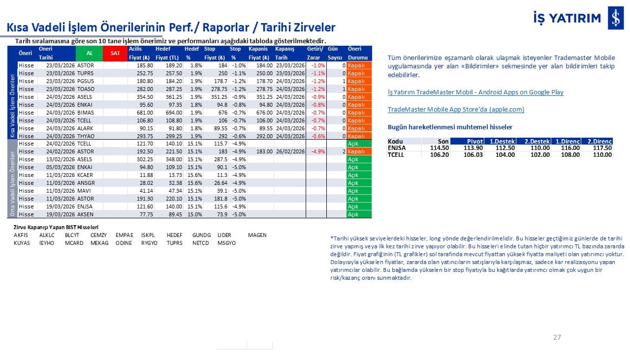 Kısa vadeli işlemlerimizin performanslarını ve tarihi zirve kapanışı yapan BIST hisselerini raporun son bölümünde görüntüleyebilirsiniz.