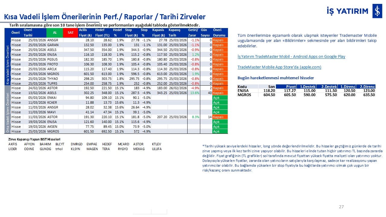 Kısa vadeli işlemlerimizin performanslarını ve tarihi zirve kapanışı yapan BIST hisselerini raporun son bölümünde görüntüleyebilirsiniz.