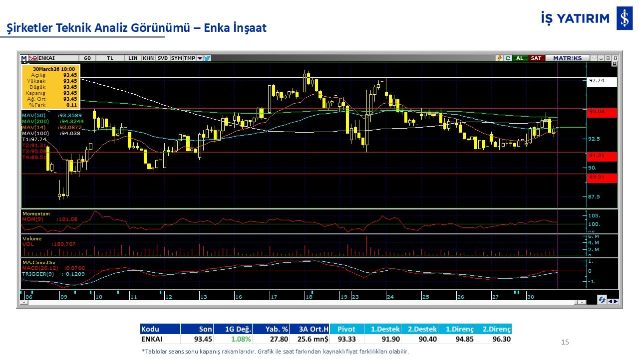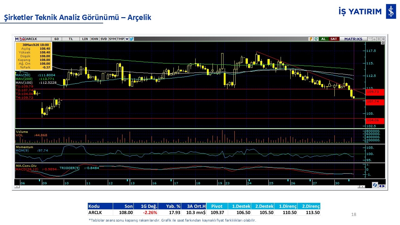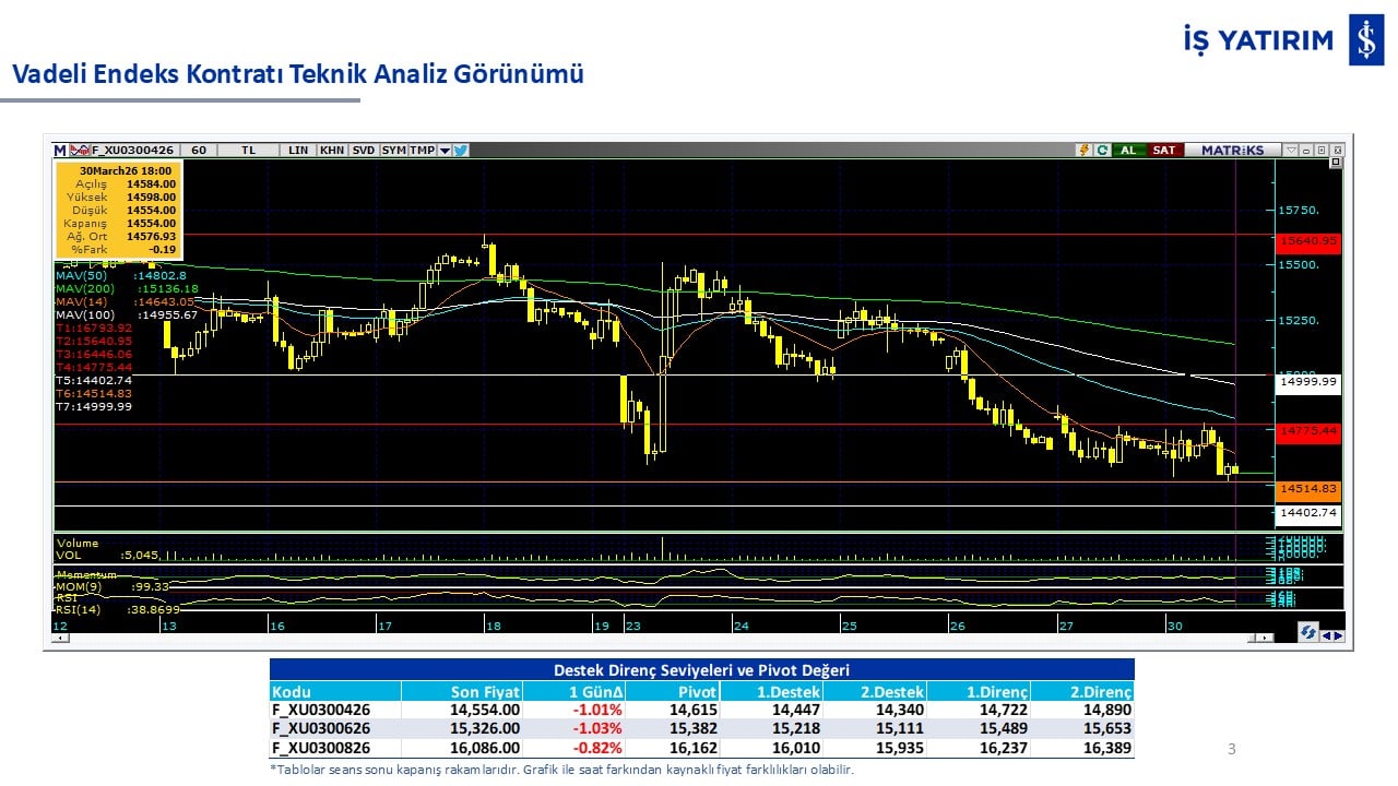 “Teknik Bülten” raporumuzun içeriğinde; Vadeli endeks, kur, BIST100 endeksi, temel analiz tarafında da öneri verdiğimiz 18 adet hissenin teknik destek/direnç seviyeleri ve buna baz teşkil eden teknik grafikleri, bugün piyasadan pozitif ayrışma ihtimali olan hisseler ve bunların teknik destek/direnç seviyeleri, piyasa rakamları, dün çok açığa satış yapılan hisse senetleri ve kısa vadeli işlem önerilerimizden son 10 tanesi yer almaktadır.