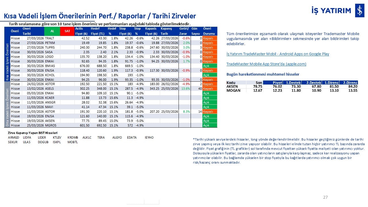 Kısa vadeli işlemlerimizin performanslarını ve tarihi zirve kapanışı yapan BIST hisselerini raporun son bölümünde görüntüleyebilirsiniz.