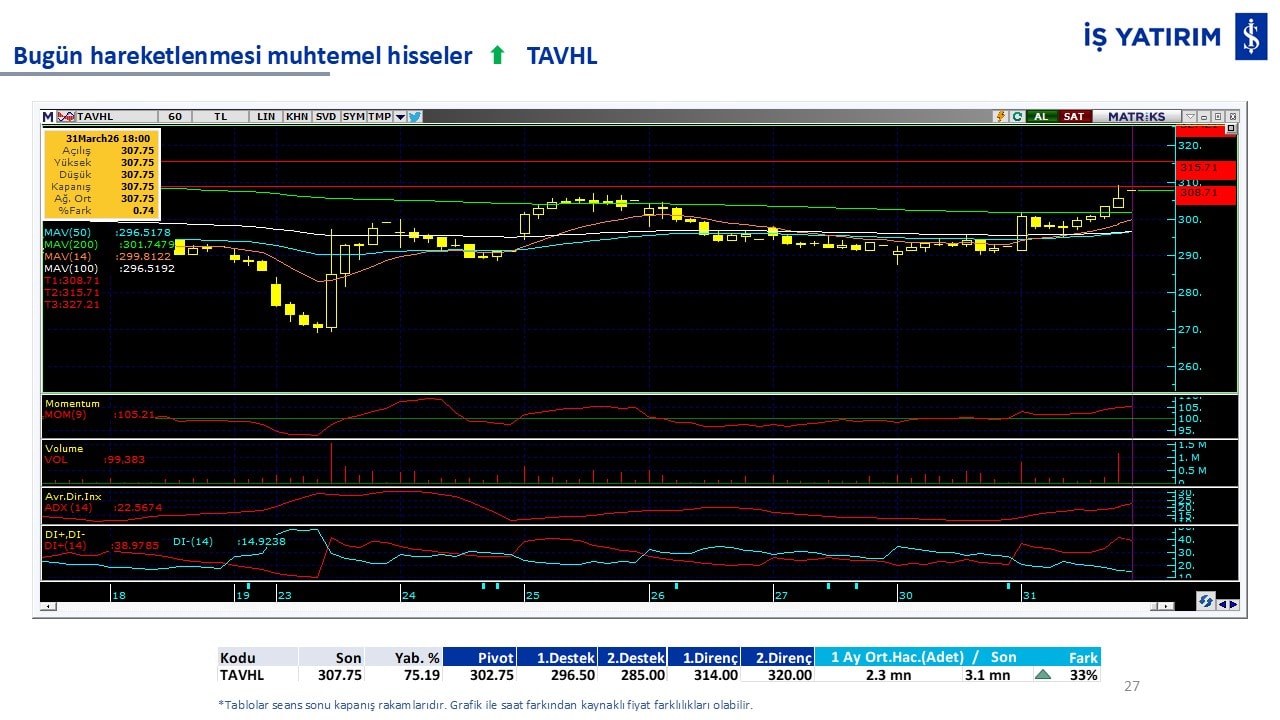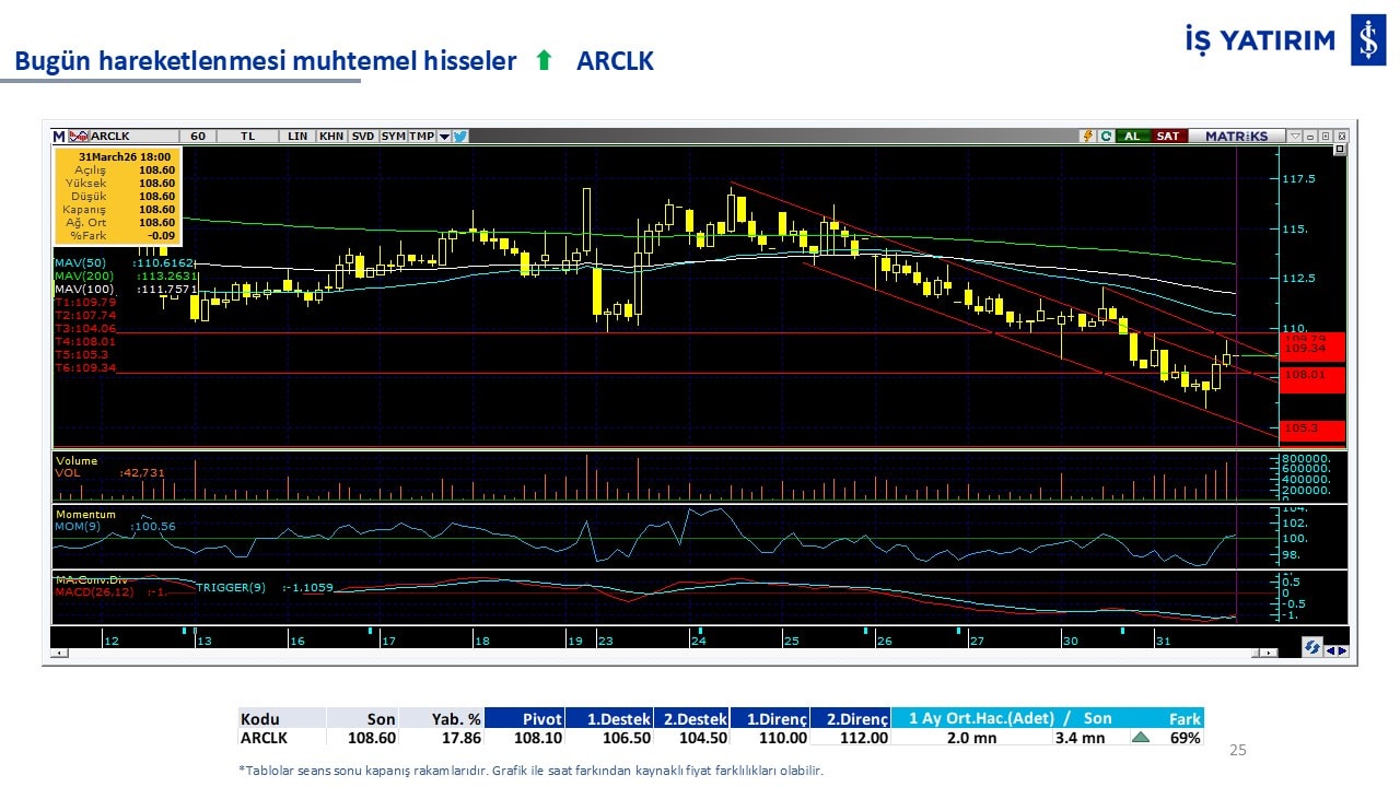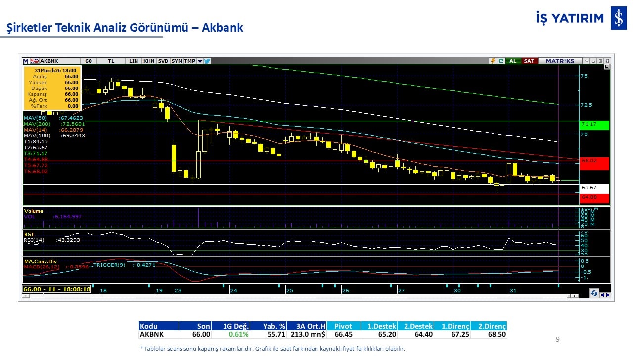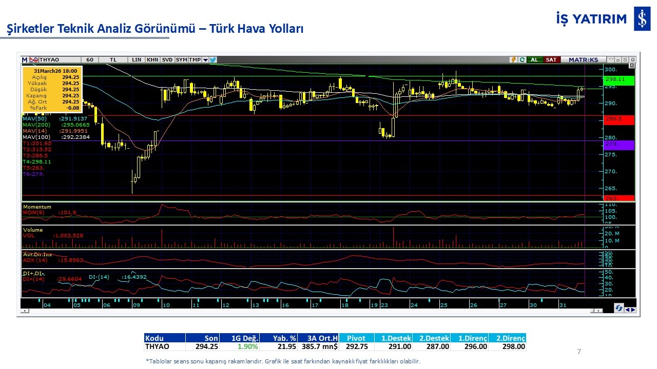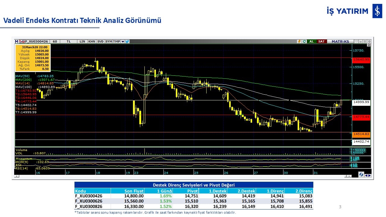 “Teknik Bülten” raporumuzun içeriğinde; Vadeli endeks, kur, BIST100 endeksi, temel analiz tarafında da öneri verdiğimiz 18 adet hissenin teknik destek/direnç seviyeleri ve buna baz teşkil eden teknik grafikleri, bugün piyasadan pozitif ayrışma ihtimali olan hisseler ve bunların teknik destek/direnç seviyeleri, piyasa rakamları, dün çok açığa satış yapılan hisse senetleri ve kısa vadeli işlem önerilerimizden son 10 tanesi yer almaktadır.