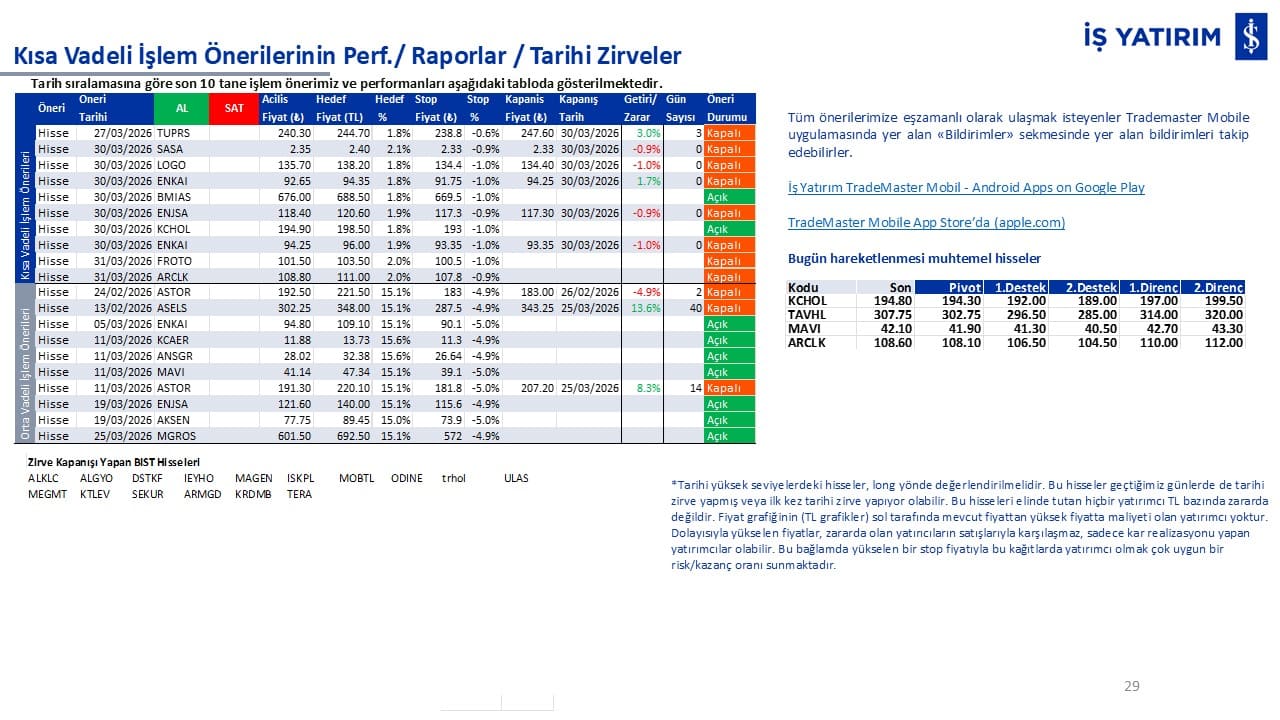 Kısa vadeli işlemlerimizin performanslarını ve tarihi zirve kapanışı yapan BIST hisselerini raporun son bölümünde görüntüleyebilirsiniz.