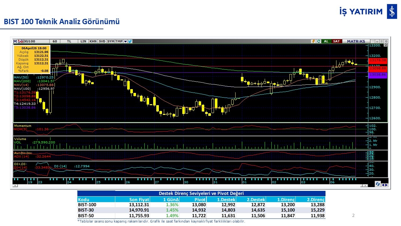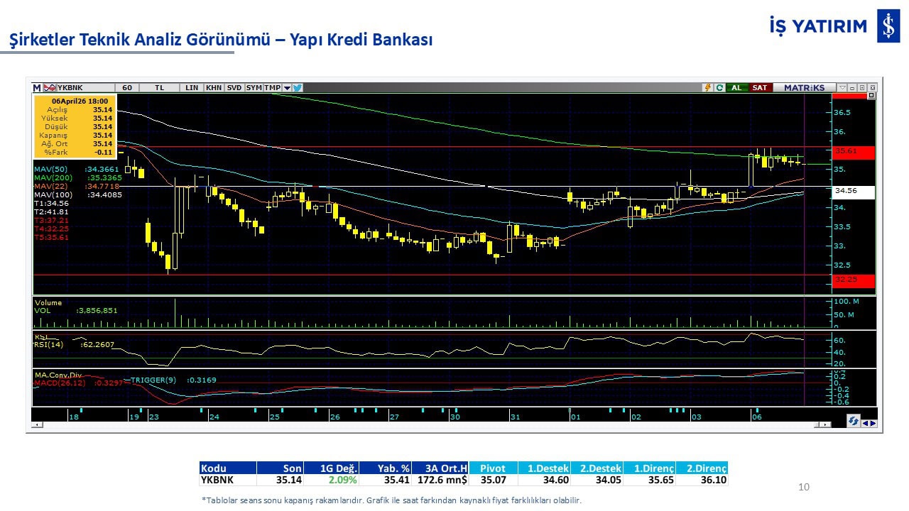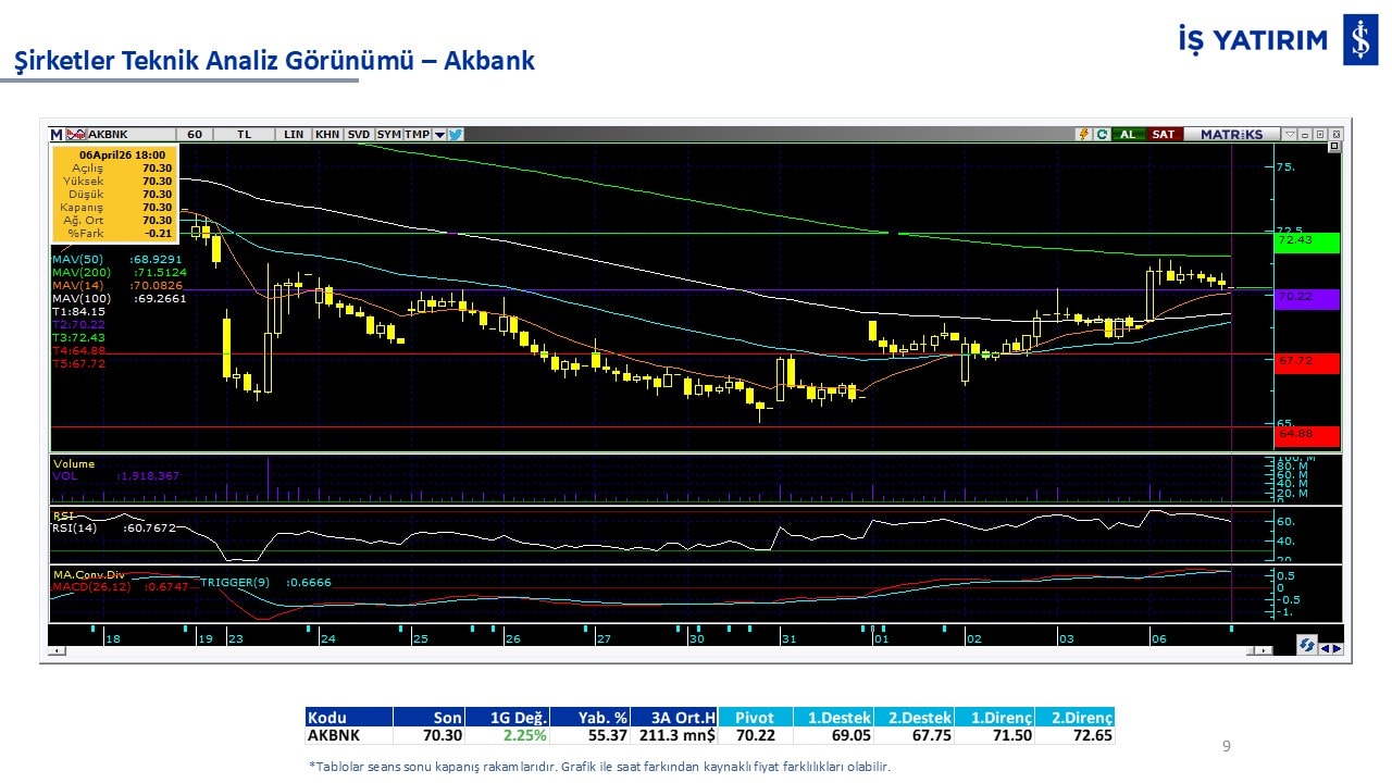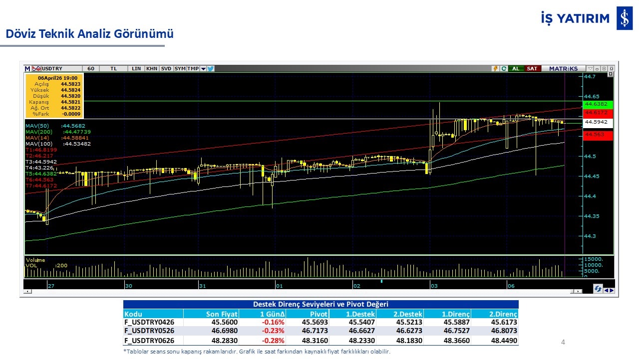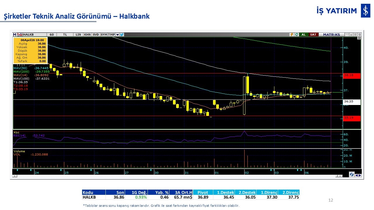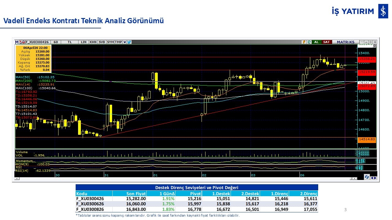 “Teknik Bülten” raporumuzun içeriğinde; Vadeli endeks, kur, BIST100 endeksi, temel analiz tarafında da öneri verdiğimiz 18 adet hissenin teknik destek/direnç seviyeleri ve buna baz teşkil eden teknik grafikleri, bugün piyasadan pozitif ayrışma ihtimali olan hisseler ve bunların teknik destek/direnç seviyeleri, piyasa rakamları, dün çok açığa satış yapılan hisse senetleri ve kısa vadeli işlem önerilerimizden son 10 tanesi yer almaktadır.