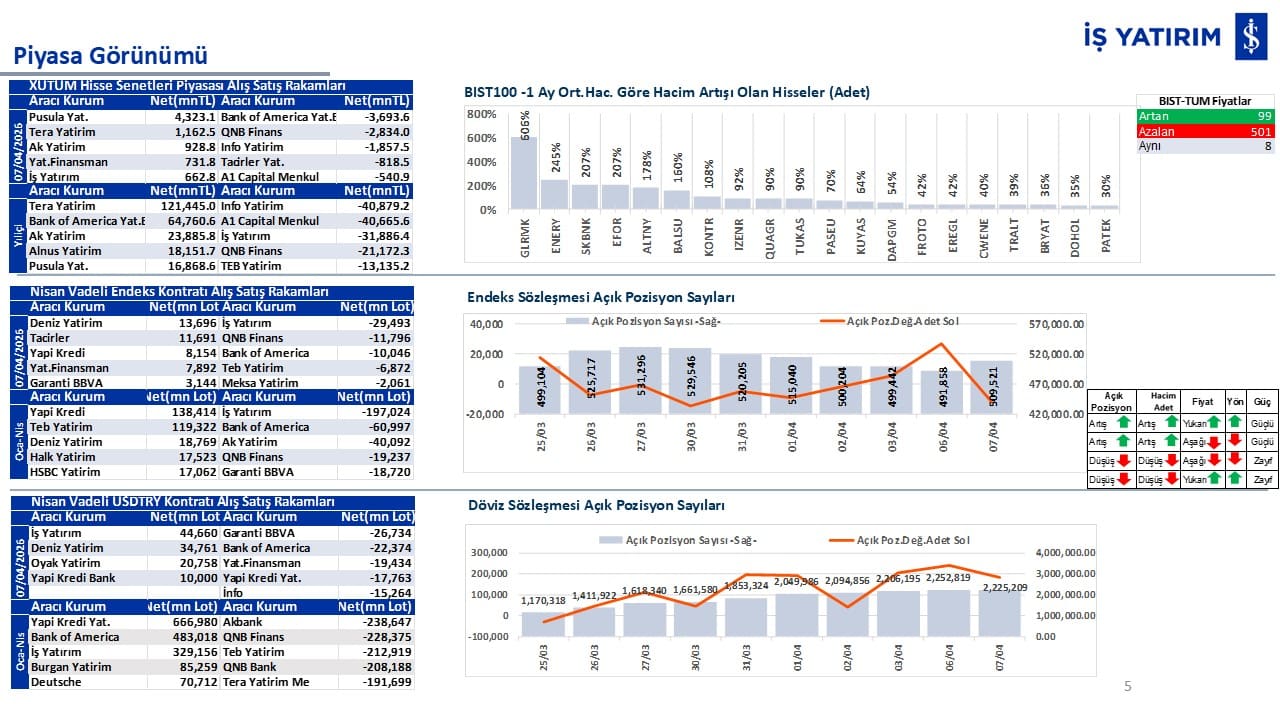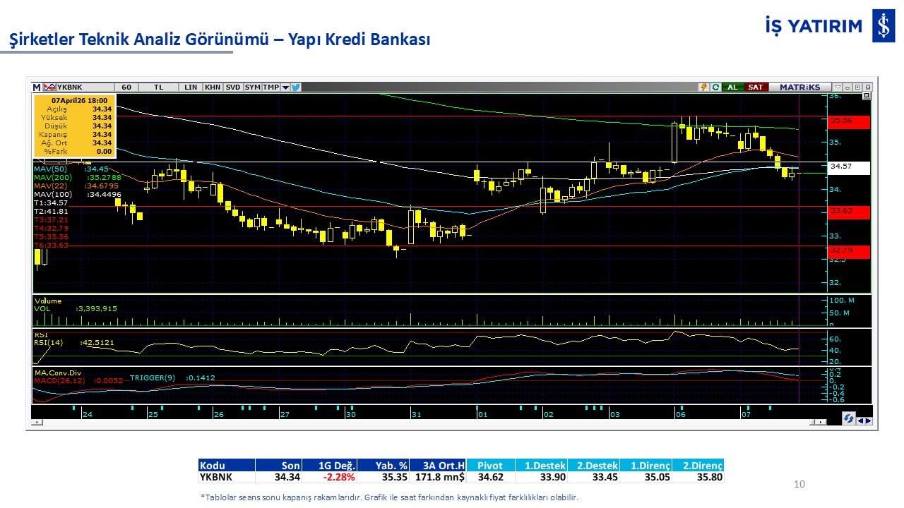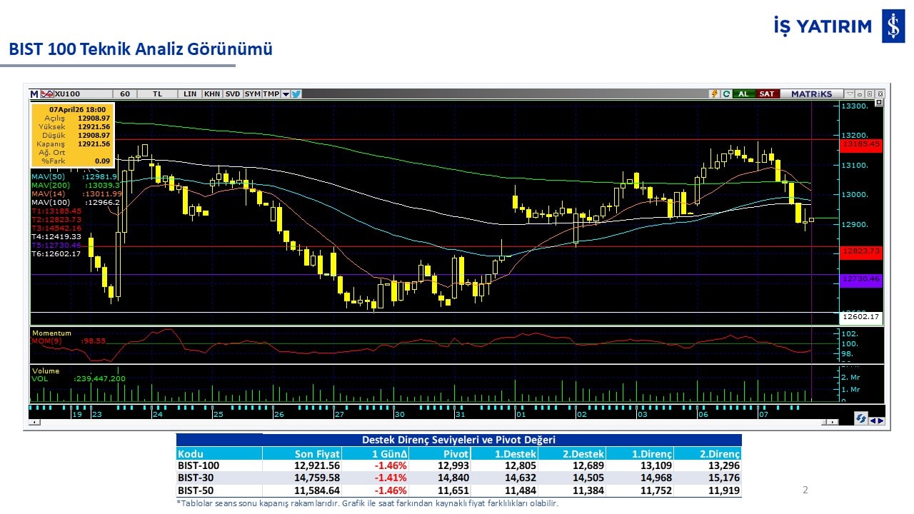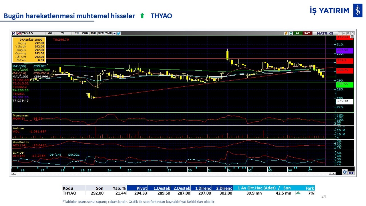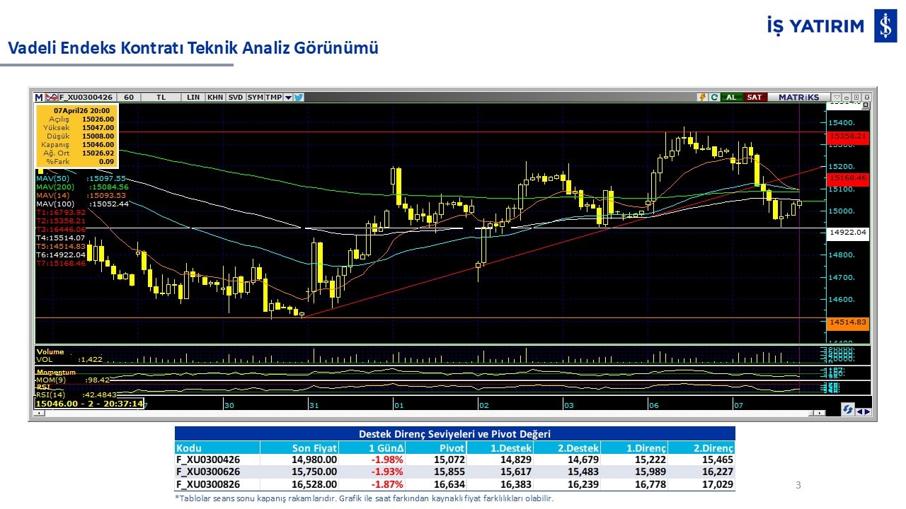 “Teknik Bülten” raporumuzun içeriğinde; Vadeli endeks, kur, BIST100 endeksi, temel analiz tarafında da öneri verdiğimiz 18 adet hissenin teknik destek/direnç seviyeleri ve buna baz teşkil eden teknik grafikleri, bugün piyasadan pozitif ayrışma ihtimali olan hisseler ve bunların teknik destek/direnç seviyeleri, piyasa rakamları, dün çok açığa satış yapılan hisse senetleri ve kısa vadeli işlem önerilerimizden son 10 tanesi yer almaktadır.