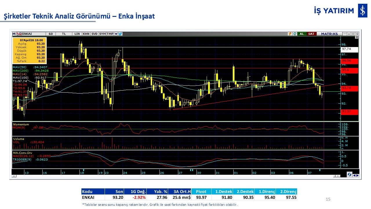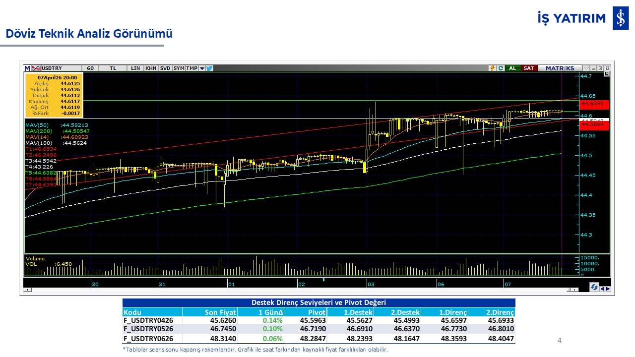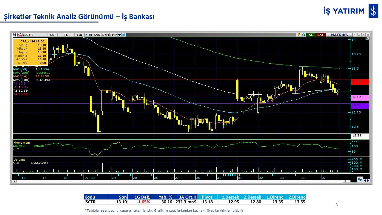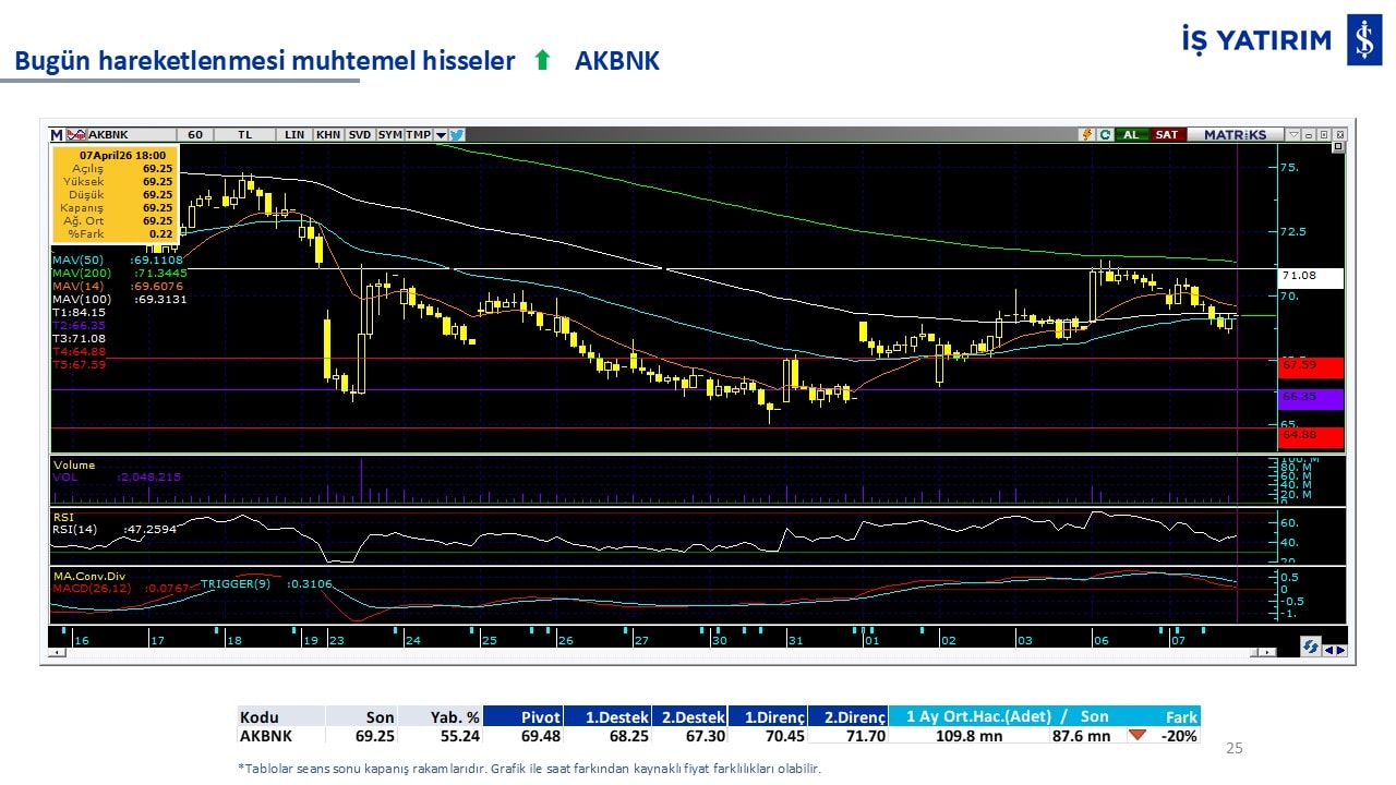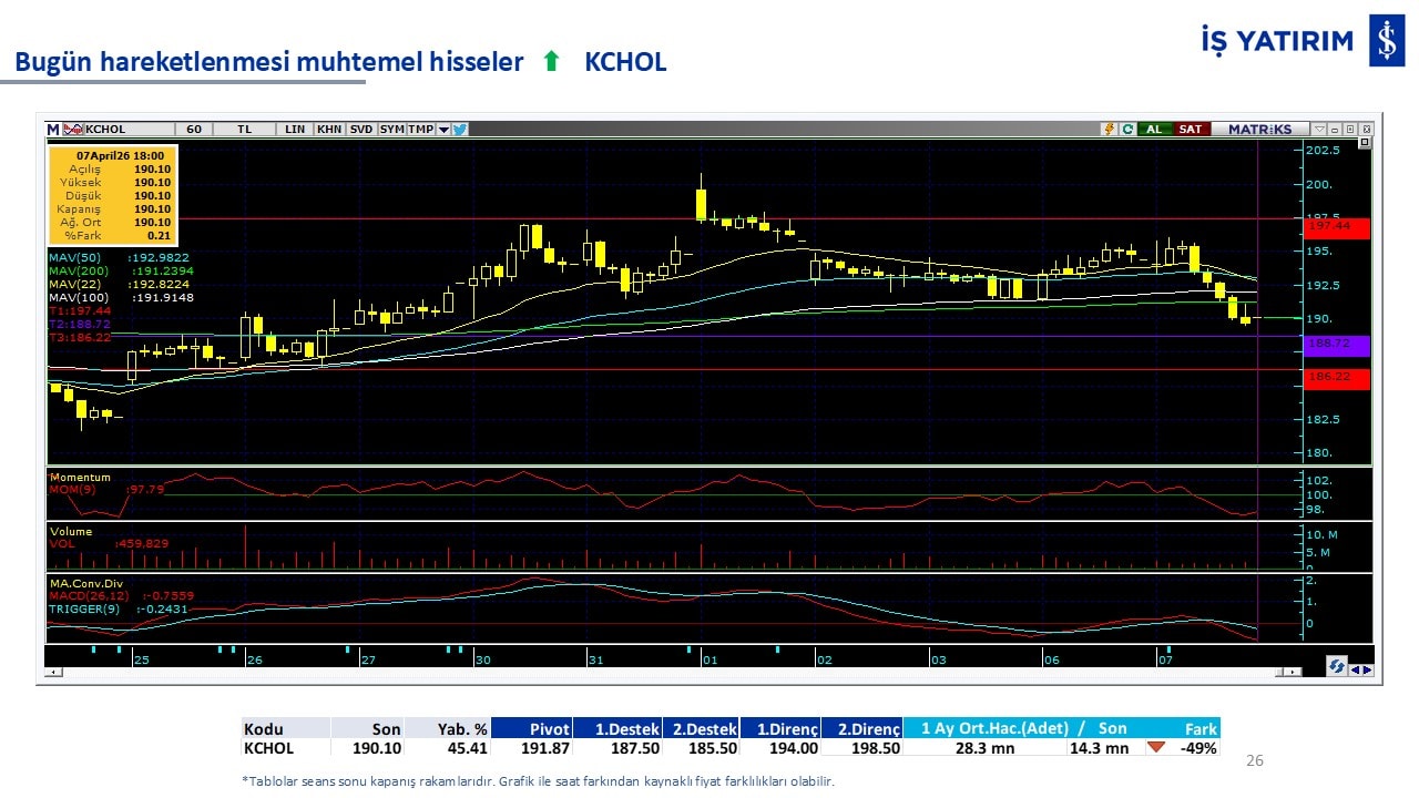 “Teknik Bülten” raporumuzun içeriğinde; Vadeli endeks, kur, BIST100 endeksi, temel analiz tarafında da öneri verdiğimiz 18 adet hissenin teknik destek/direnç seviyeleri ve buna baz teşkil eden teknik grafikleri, bugün piyasadan pozitif ayrışma ihtimali olan hisseler ve bunların teknik destek/direnç seviyeleri, piyasa rakamları, dün çok açığa satış yapılan hisse senetleri ve kısa vadeli işlem önerilerimizden son 10 tanesi yer almaktadır.