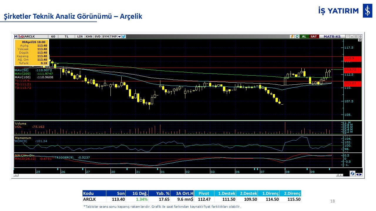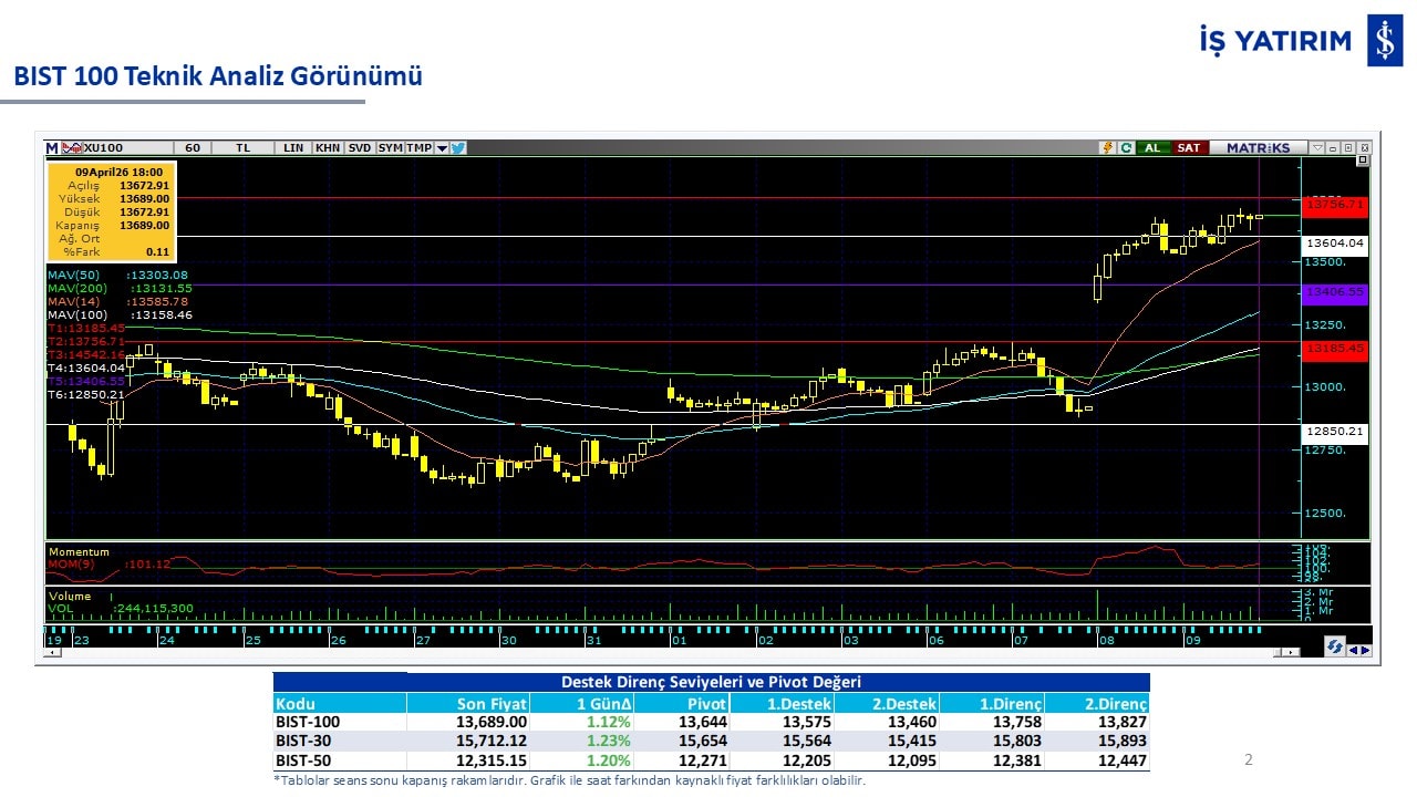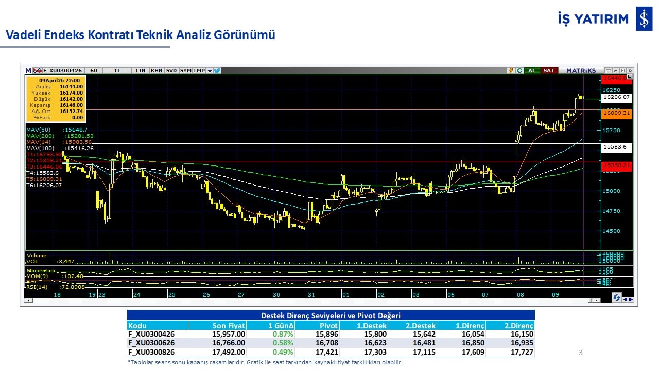 “Teknik Bülten” raporumuzun içeriğinde; Vadeli endeks, kur, BIST100 endeksi, temel analiz tarafında da öneri verdiğimiz 18 adet hissenin teknik destek/direnç seviyeleri ve buna baz teşkil eden teknik grafikleri, bugün piyasadan pozitif ayrışma ihtimali olan hisseler ve bunların teknik destek/direnç seviyeleri, piyasa rakamları, dün çok açığa satış yapılan hisse senetleri ve kısa vadeli işlem önerilerimizden son 10 tanesi yer almaktadır.