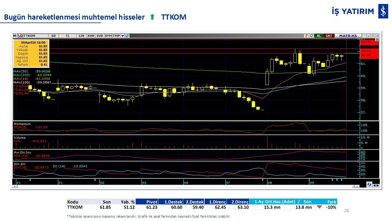 Bugün hareketlenmesi muhtemel hisseler: TTKOM-SAHOL-ARCLK