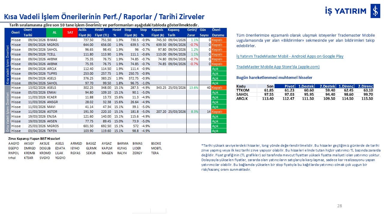 Kısa vadeli işlemlerimizin performanslarını ve tarihi zirve kapanışı yapan BIST hisselerini raporun son bölümünde görüntüleyebilirsiniz.