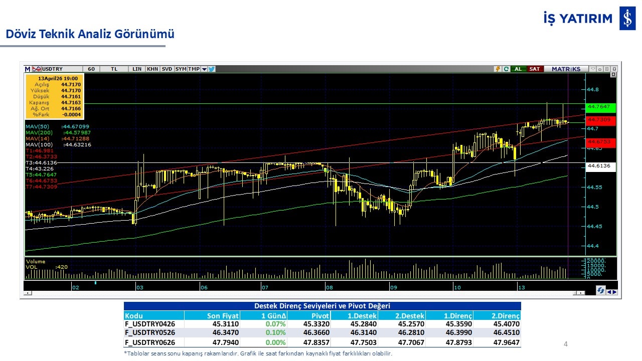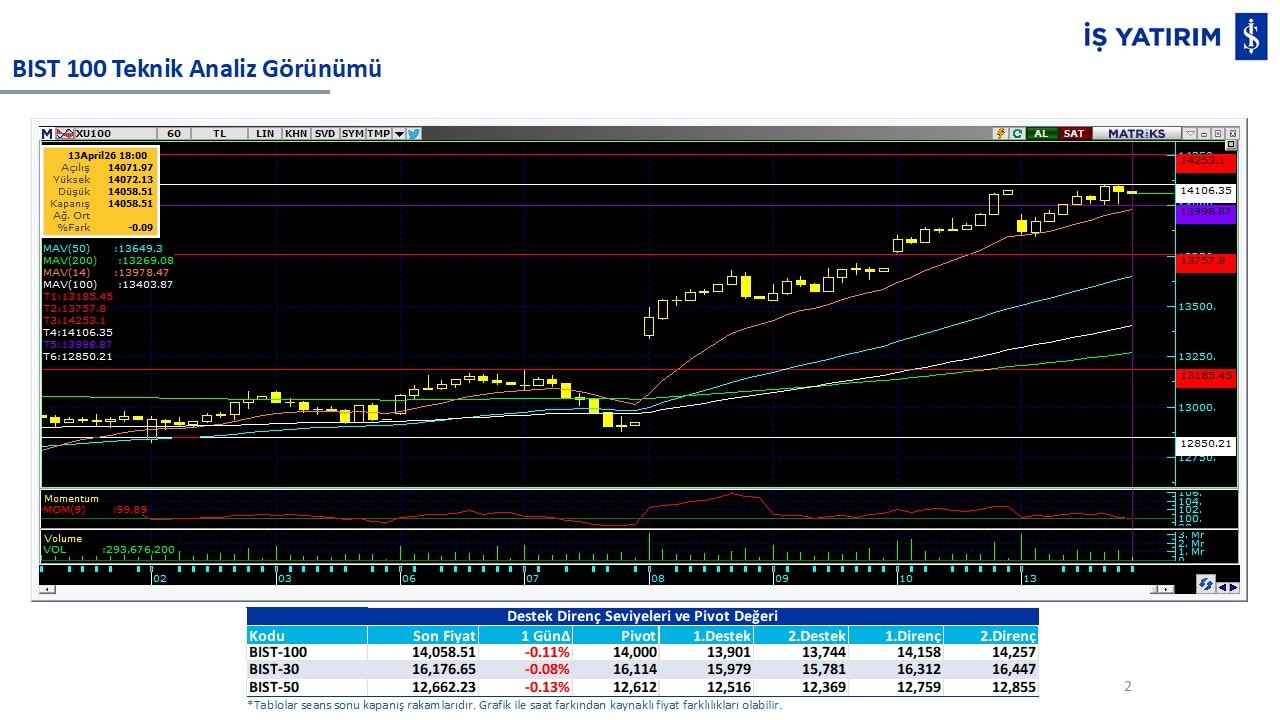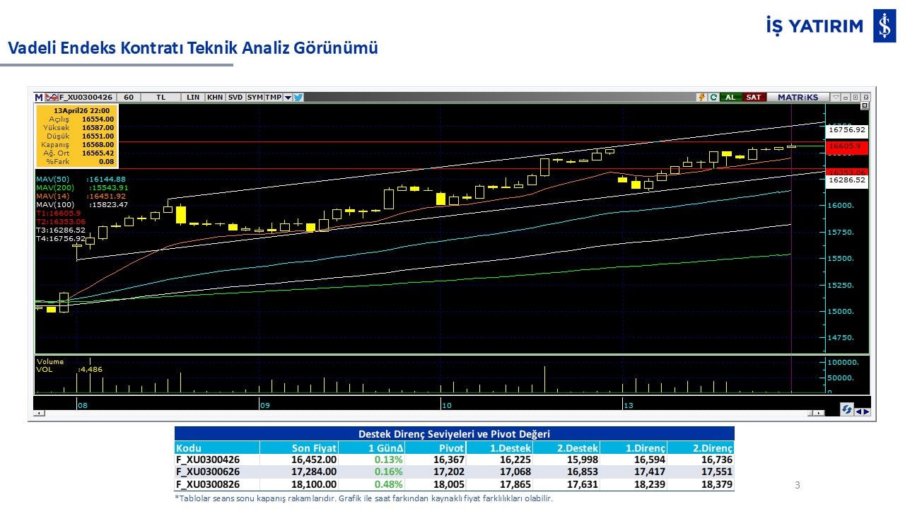 “Teknik Bülten” raporumuzun içeriğinde; Vadeli endeks, kur, BIST100 endeksi, temel analiz tarafında da öneri verdiğimiz 18 adet hissenin teknik destek/direnç seviyeleri ve buna baz teşkil eden teknik grafikleri, bugün piyasadan pozitif ayrışma ihtimali olan hisseler ve bunların teknik destek/direnç seviyeleri, piyasa rakamları, dün çok açığa satış yapılan hisse senetleri ve kısa vadeli işlem önerilerimizden son 10 tanesi yer almaktadır.