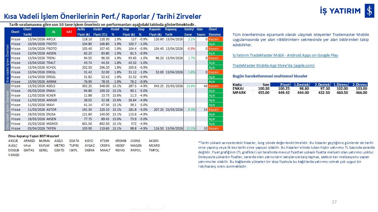 Kısa vadeli işlemlerimizin performanslarını ve tarihi zirve kapanışı yapan BIST hisselerini raporun son bölümünde görüntüleyebilirsiniz.