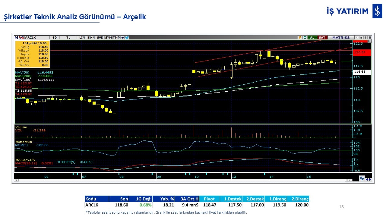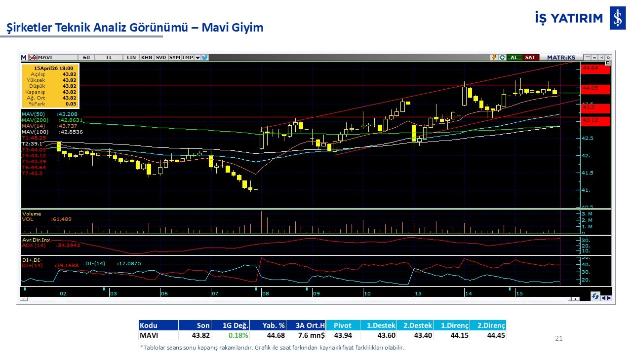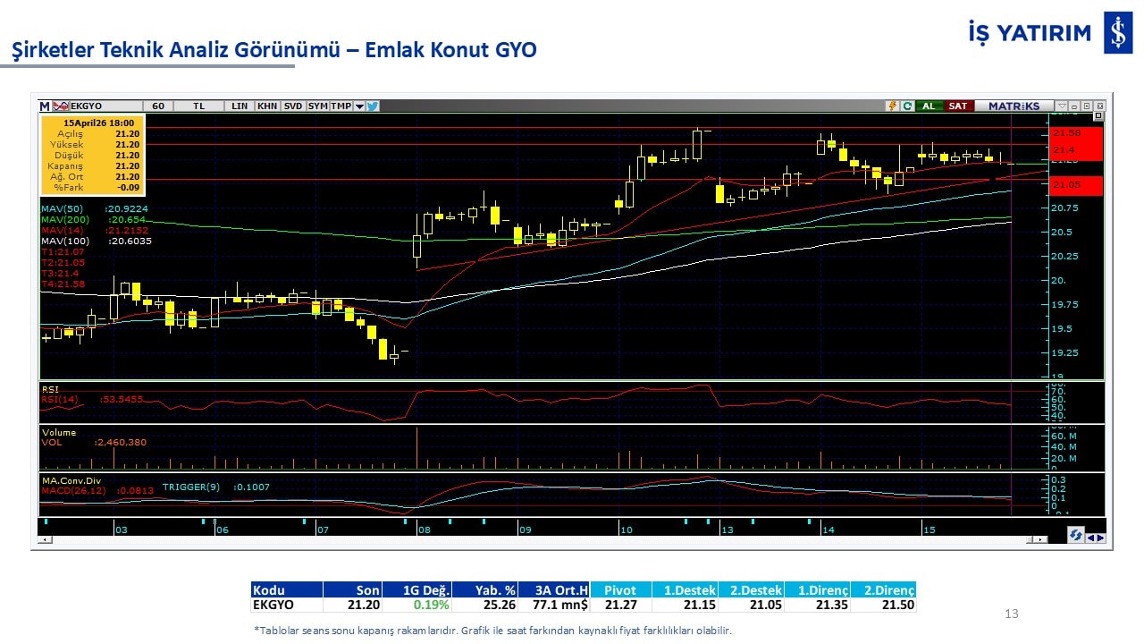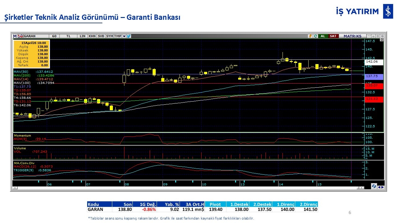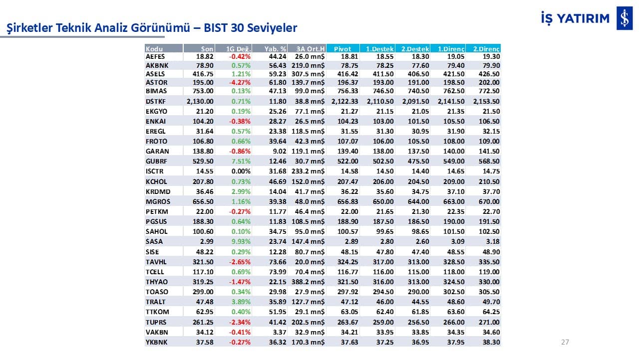 Teknik analiz görünümü olan şirketler: GARAN, THYAO, ISCTR, AKBNK, YKBNK, VAKBN, HALKB, EKGYO, TCELL, ENKAI, KCHOL, MAVI, ARCLK, ALARK, SAHOL, AGHOL, SOKM, MPARK.