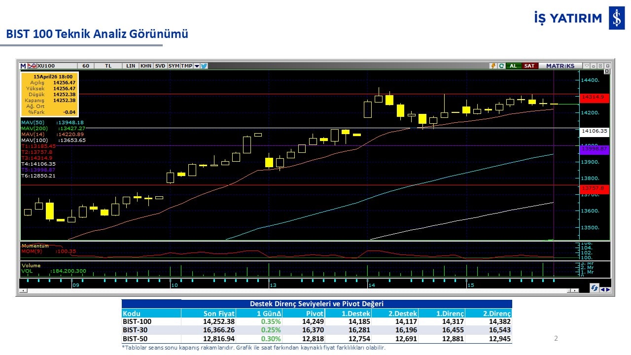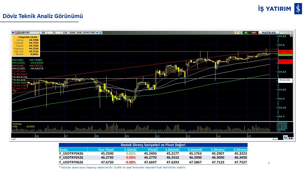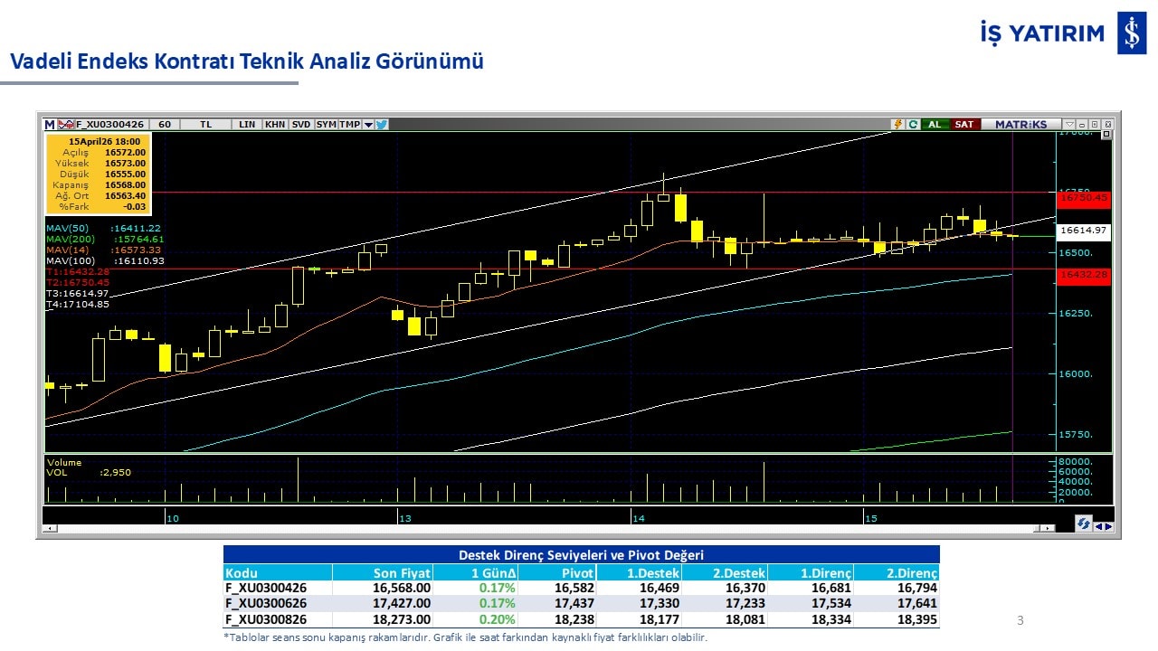 “Teknik Bülten” raporumuzun içeriğinde; Vadeli endeks, kur, BIST100 endeksi, temel analiz tarafında da öneri verdiğimiz 18 adet hissenin teknik destek/direnç seviyeleri ve buna baz teşkil eden teknik grafikleri, bugün piyasadan pozitif ayrışma ihtimali olan hisseler ve bunların teknik destek/direnç seviyeleri, piyasa rakamları, dün çok açığa satış yapılan hisse senetleri ve kısa vadeli işlem önerilerimizden son 10 tanesi yer almaktadır.