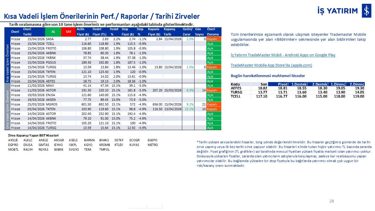 Kısa vadeli işlemlerimizin performanslarını ve tarihi zirve kapanışı yapan BIST hisselerini raporun son bölümünde görüntüleyebilirsiniz.