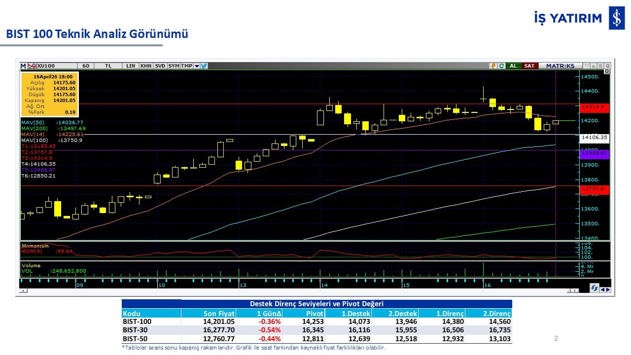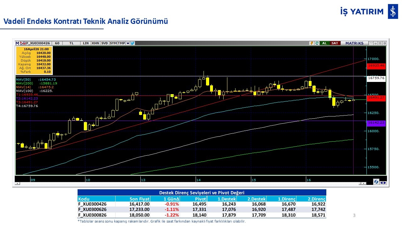 “Teknik Bülten” raporumuzun içeriğinde; Vadeli endeks, kur, BIST100 endeksi, temel analiz tarafında da öneri verdiğimiz 18 adet hissenin teknik destek/direnç seviyeleri ve buna baz teşkil eden teknik grafikleri, bugün piyasadan pozitif ayrışma ihtimali olan hisseler ve bunların teknik destek/direnç seviyeleri, piyasa rakamları, dün çok açığa satış yapılan hisse senetleri ve kısa vadeli işlem önerilerimizden son 10 tanesi yer almaktadır.