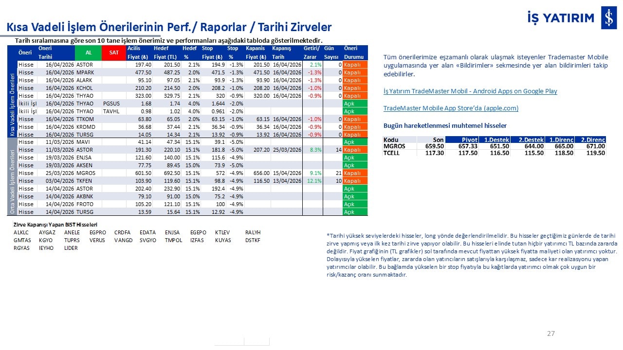 Kısa vadeli işlemlerimizin performanslarını ve tarihi zirve kapanışı yapan BIST hisselerini raporun son bölümünde görüntüleyebilirsiniz.