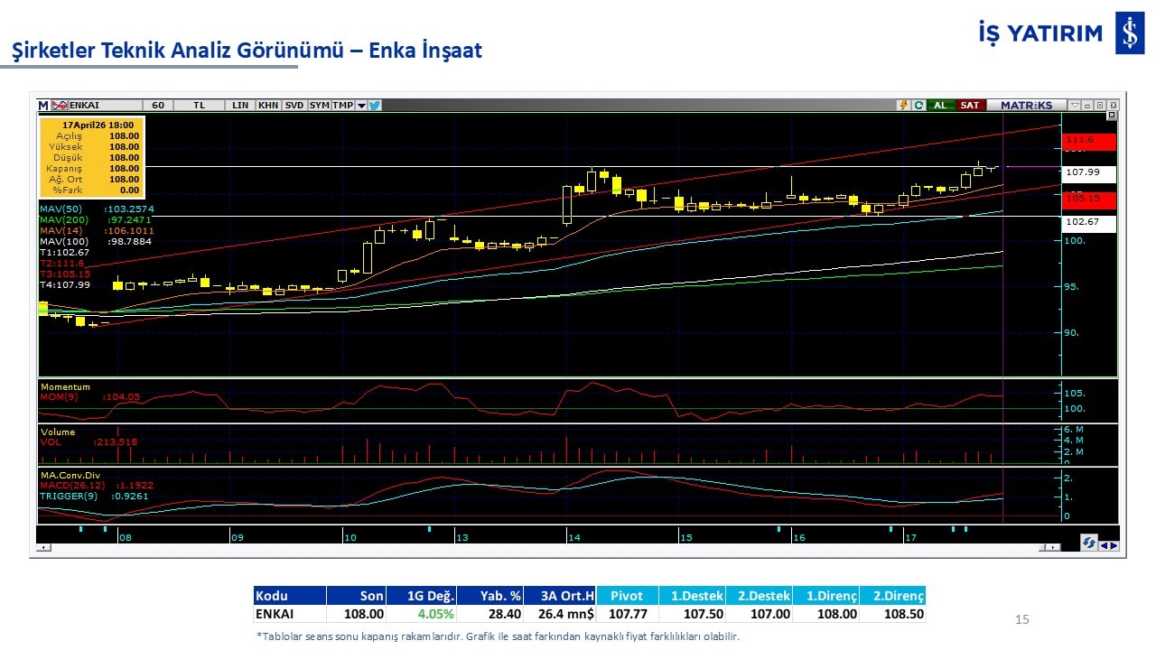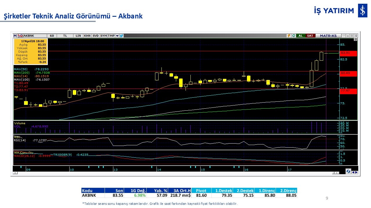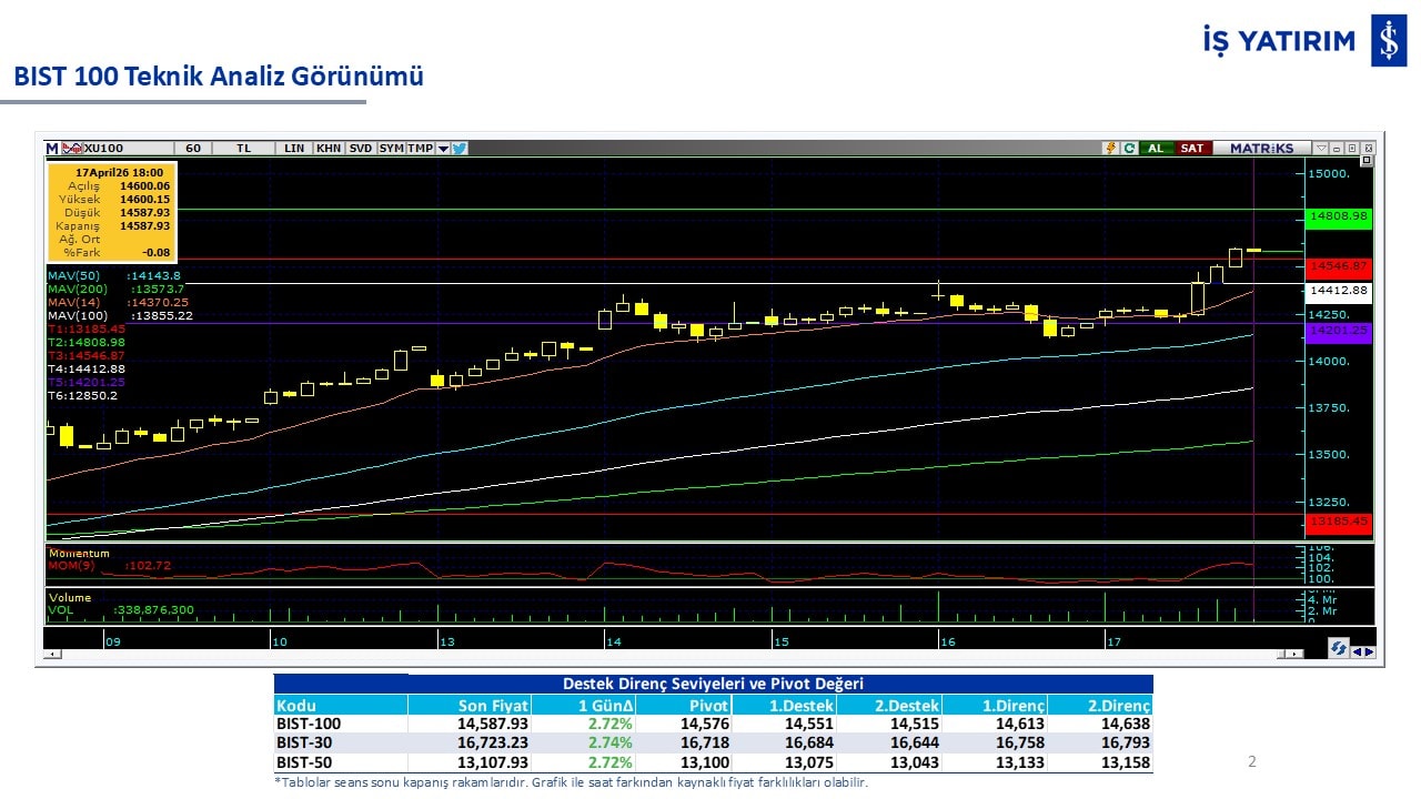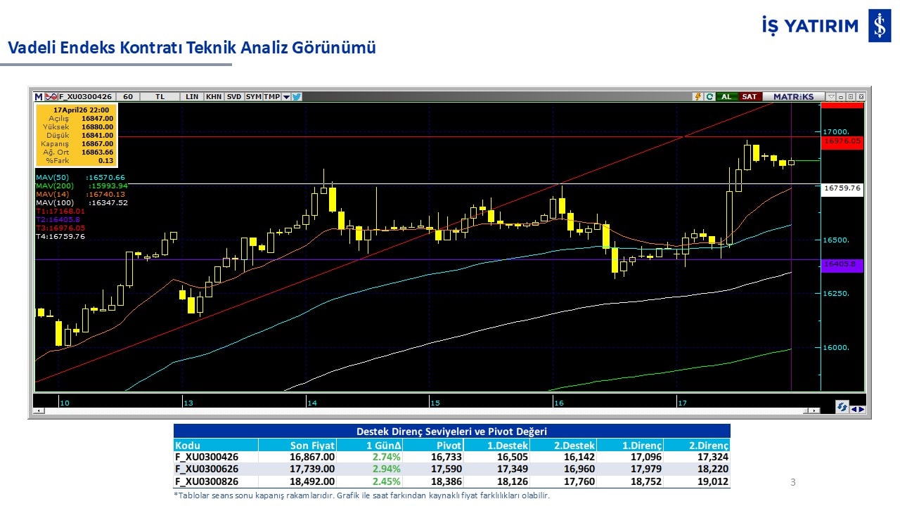 “Teknik Bülten” raporumuzun içeriğinde; Vadeli endeks, kur, BIST100 endeksi, temel analiz tarafında da öneri verdiğimiz 18 adet hissenin teknik destek/direnç seviyeleri ve buna baz teşkil eden teknik grafikleri, bugün piyasadan pozitif ayrışma ihtimali olan hisseler ve bunların teknik destek/direnç seviyeleri, piyasa rakamları, dün çok açığa satış yapılan hisse senetleri ve kısa vadeli işlem önerilerimizden son 10 tanesi yer almaktadır.