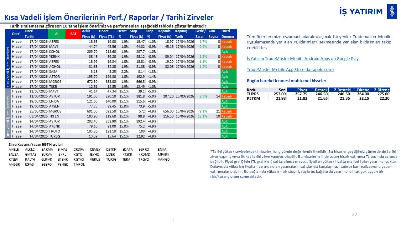 Kısa vadeli işlemlerimizin performanslarını ve tarihi zirve kapanışı yapan BIST hisselerini raporun son bölümünde görüntüleyebilirsiniz.