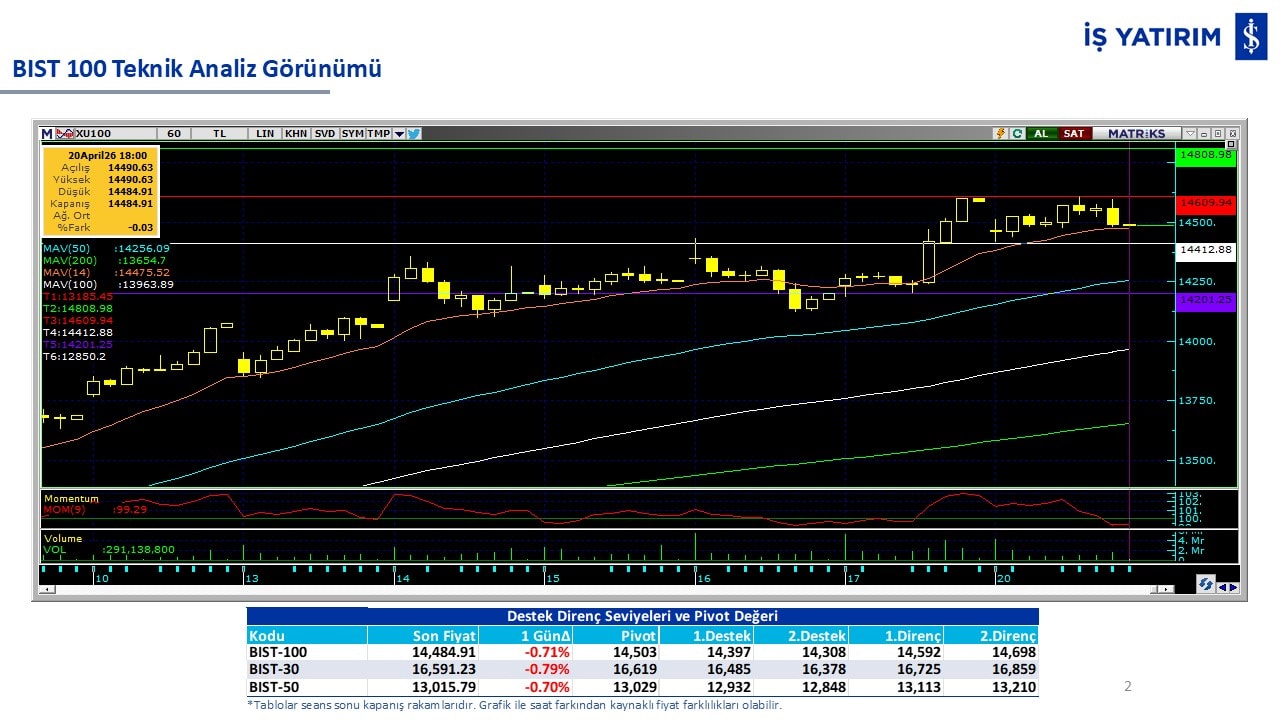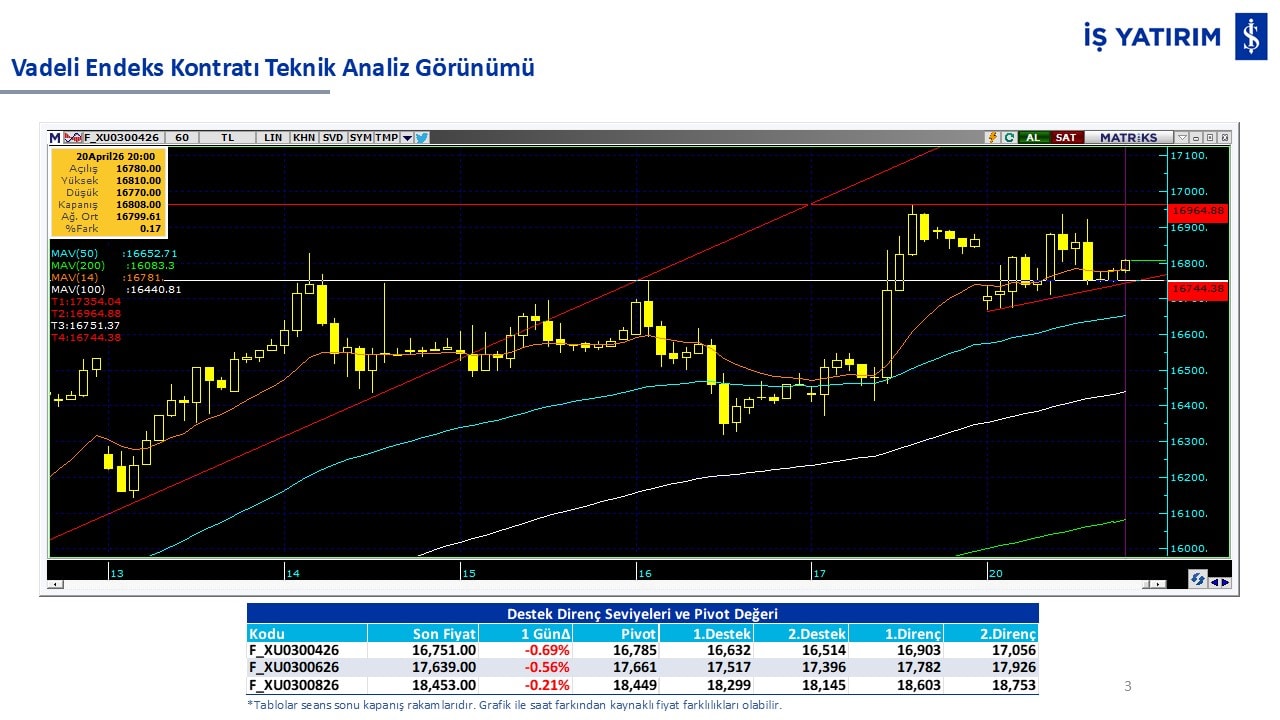 “Teknik Bülten” raporumuzun içeriğinde; Vadeli endeks, kur, BIST100 endeksi, temel analiz tarafında da öneri verdiğimiz 18 adet hissenin teknik destek/direnç seviyeleri ve buna baz teşkil eden teknik grafikleri, bugün piyasadan pozitif ayrışma ihtimali olan hisseler ve bunların teknik destek/direnç seviyeleri, piyasa rakamları, dün çok açığa satış yapılan hisse senetleri ve kısa vadeli işlem önerilerimizden son 10 tanesi yer almaktadır.