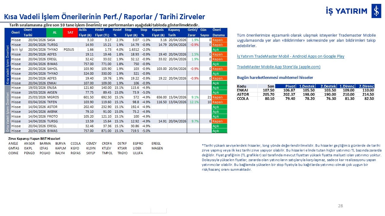 Kısa vadeli işlemlerimizin performanslarını ve tarihi zirve kapanışı yapan BIST hisselerini raporun son bölümünde görüntüleyebilirsiniz.