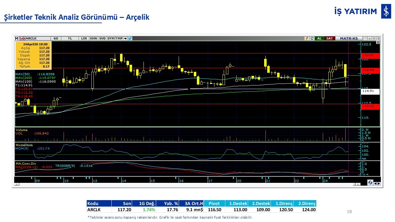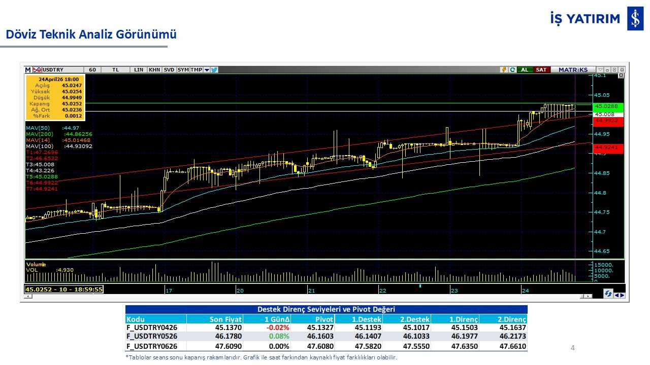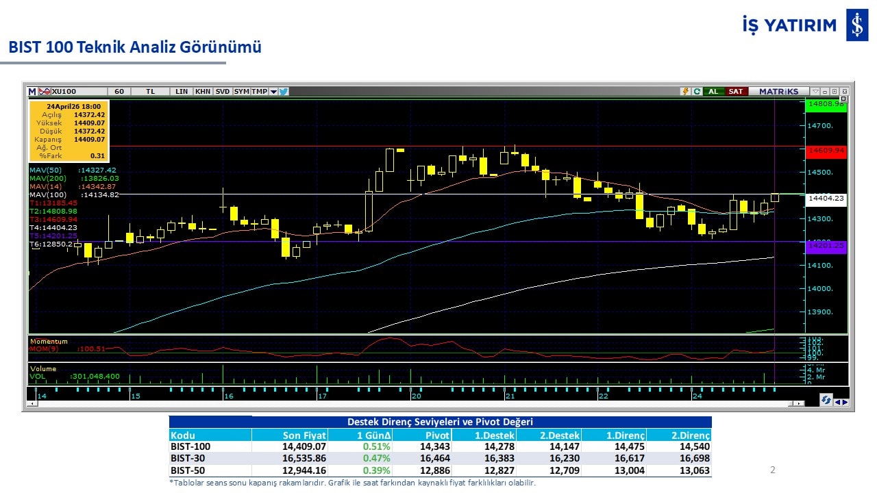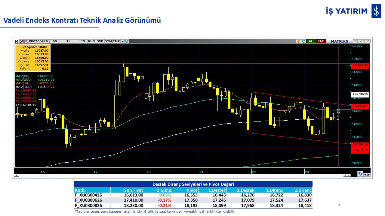 “Teknik Bülten” raporumuzun içeriğinde; Vadeli endeks, kur, BIST100 endeksi, temel analiz tarafında da öneri verdiğimiz 18 adet hissenin teknik destek/direnç seviyeleri ve buna baz teşkil eden teknik grafikleri, bugün piyasadan pozitif ayrışma ihtimali olan hisseler ve bunların teknik destek/direnç seviyeleri, piyasa rakamları, dün çok açığa satış yapılan hisse senetleri ve kısa vadeli işlem önerilerimizden son 10 tanesi yer almaktadır.