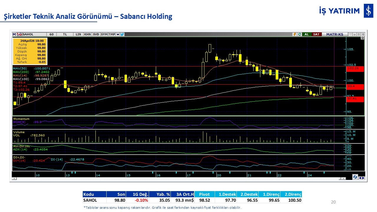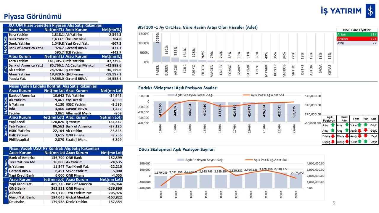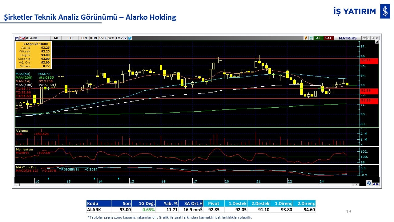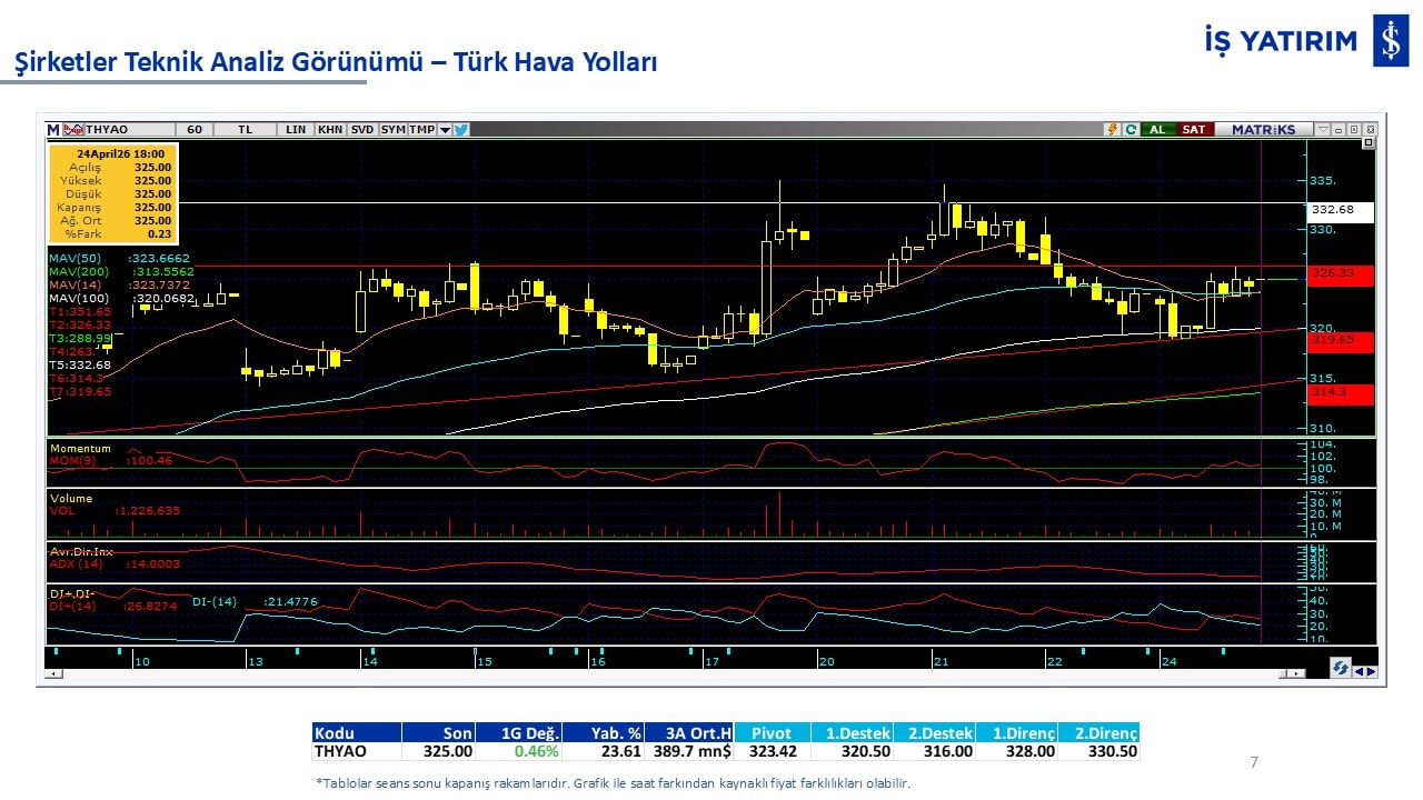 “Teknik Bülten” raporumuzun içeriğinde; Vadeli endeks, kur, BIST100 endeksi, temel analiz tarafında da öneri verdiğimiz 18 adet hissenin teknik destek/direnç seviyeleri ve buna baz teşkil eden teknik grafikleri, bugün piyasadan pozitif ayrışma ihtimali olan hisseler ve bunların teknik destek/direnç seviyeleri, piyasa rakamları, dün çok açığa satış yapılan hisse senetleri ve kısa vadeli işlem önerilerimizden son 10 tanesi yer almaktadır.