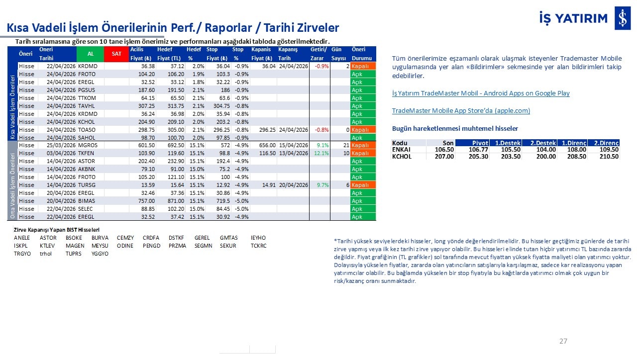 Kısa vadeli işlemlerimizin performanslarını ve tarihi zirve kapanışı yapan BIST hisselerini raporun son bölümünde görüntüleyebilirsiniz.