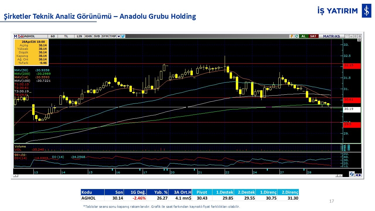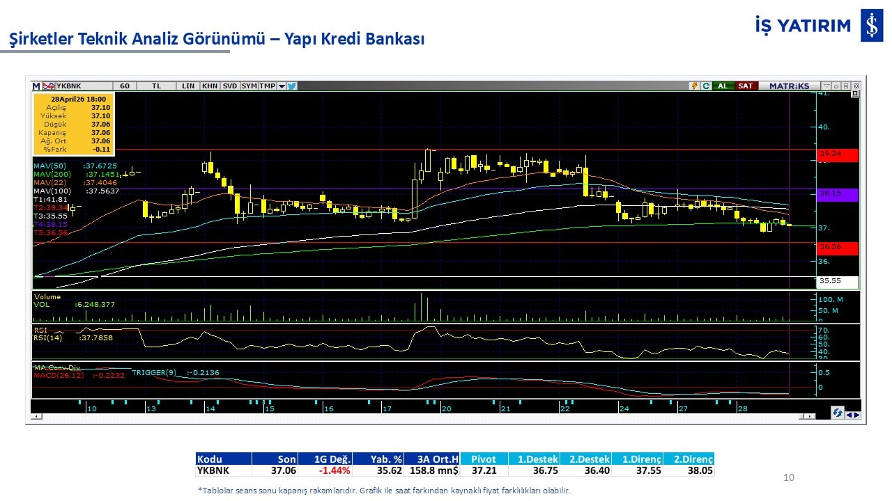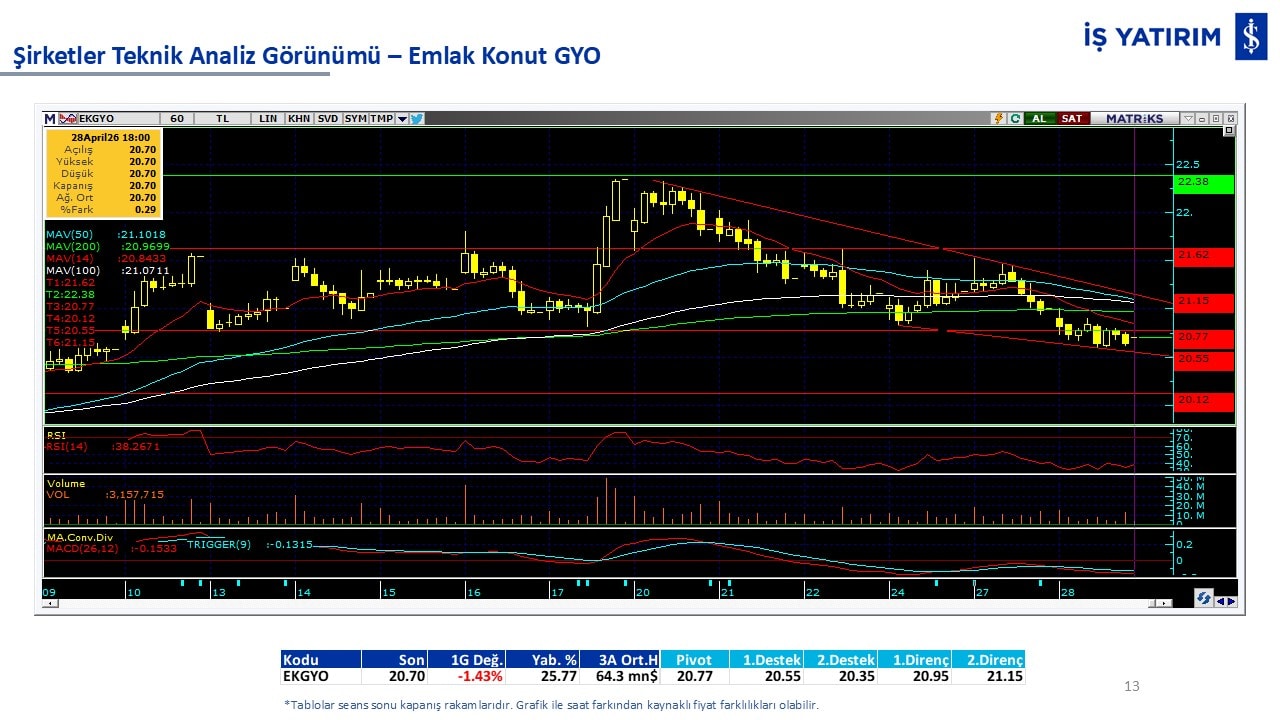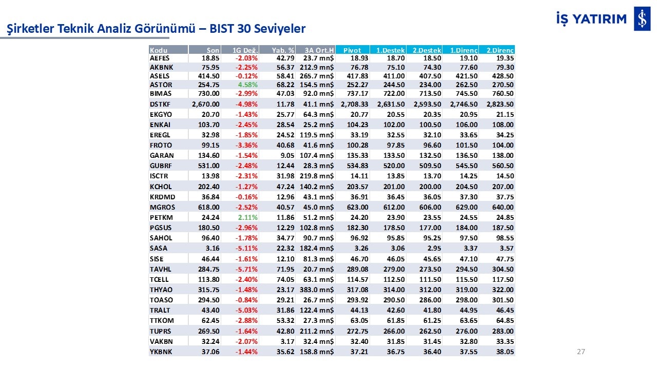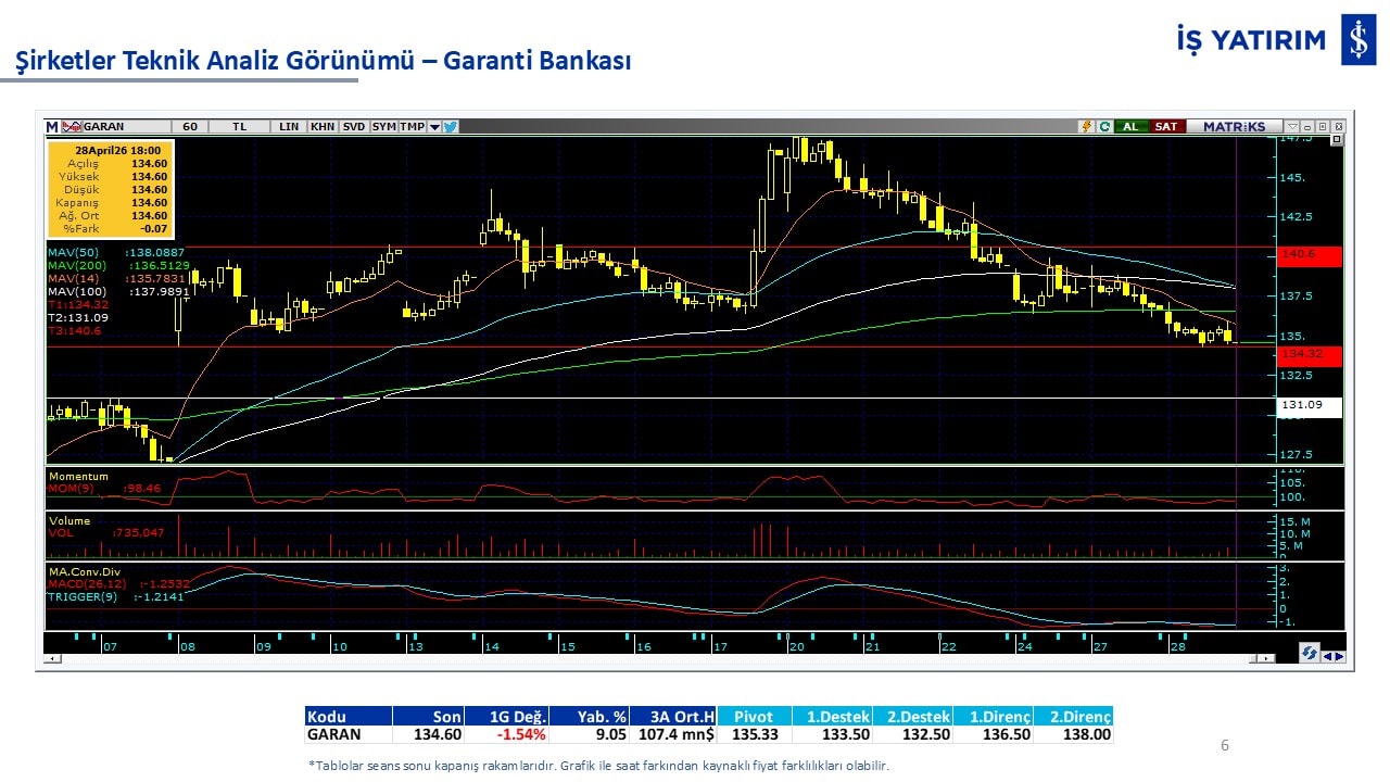 Teknik analiz görünümü olan şirketler: GARAN, THYAO, ISCTR, AKBNK, YKBNK, VAKBN, HALKB, EKGYO, TCELL, ENKAI, KCHOL, MAVI, ARCLK, ALARK, SAHOL, AGHOL, SOKM, MPARK.