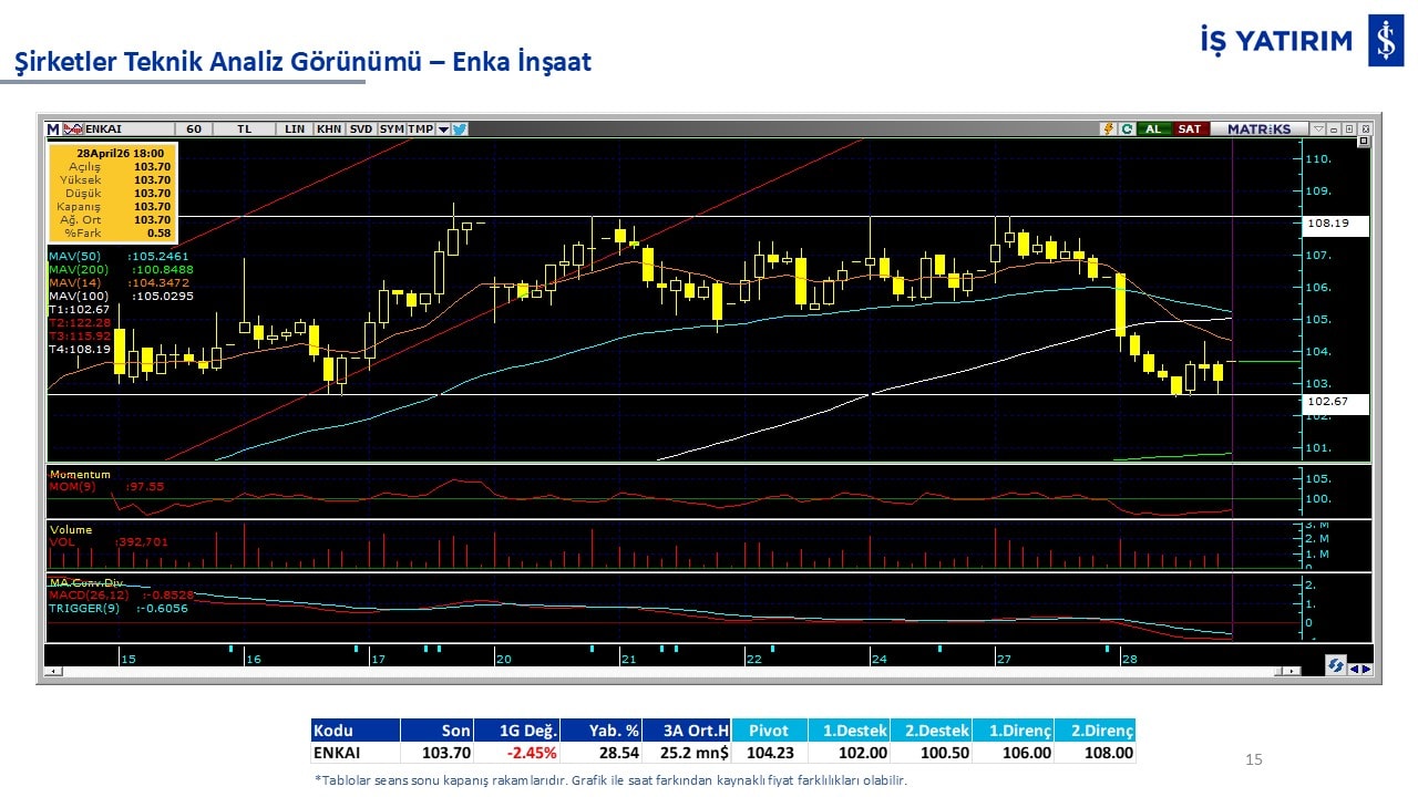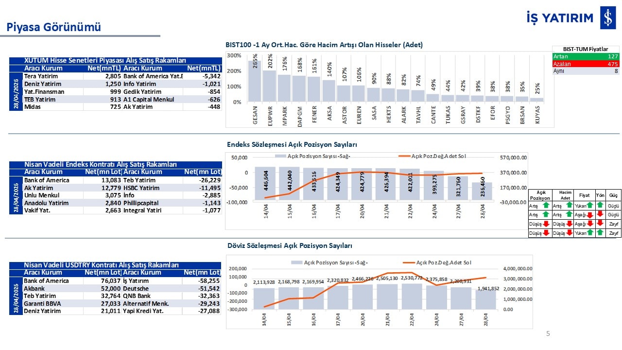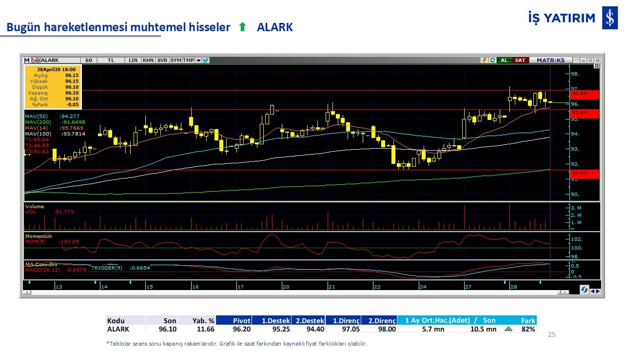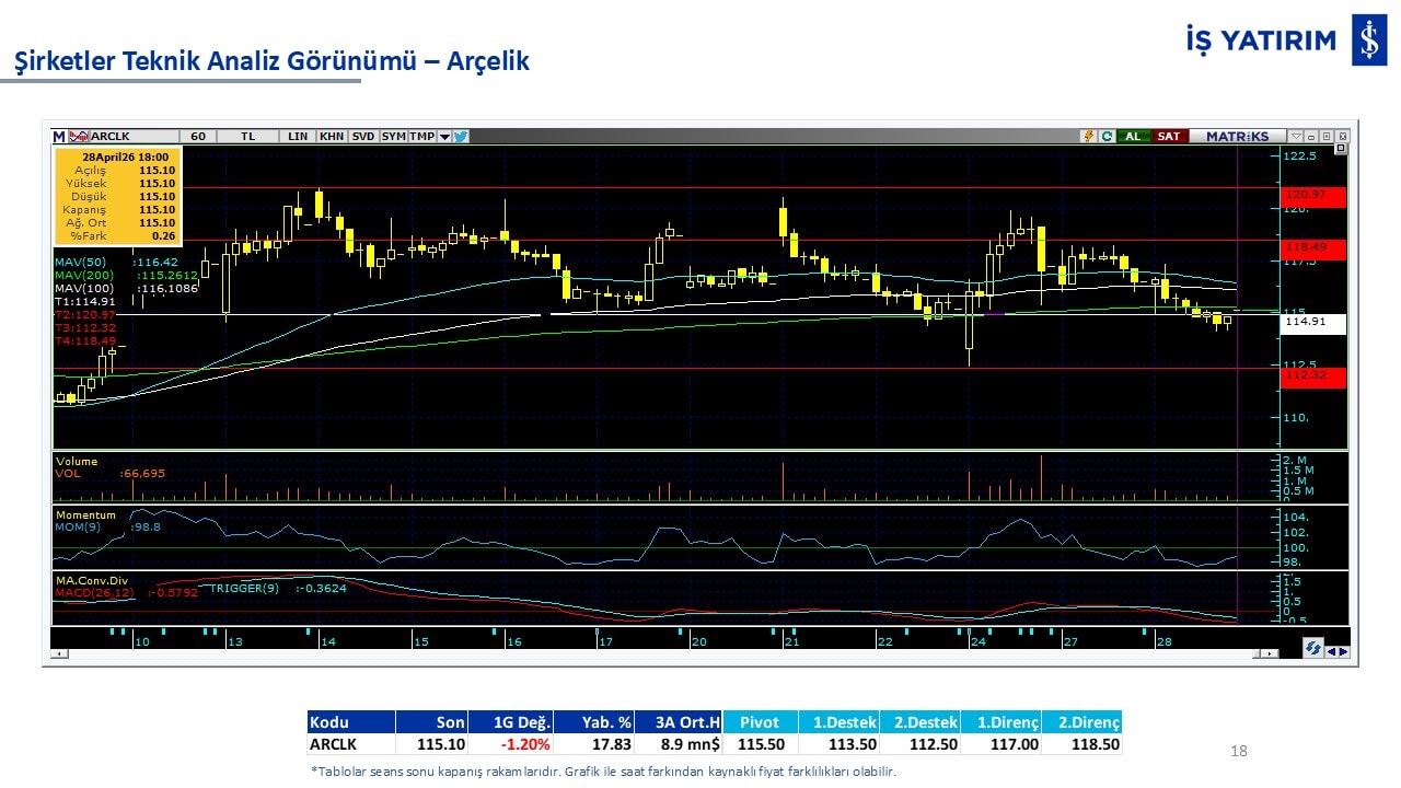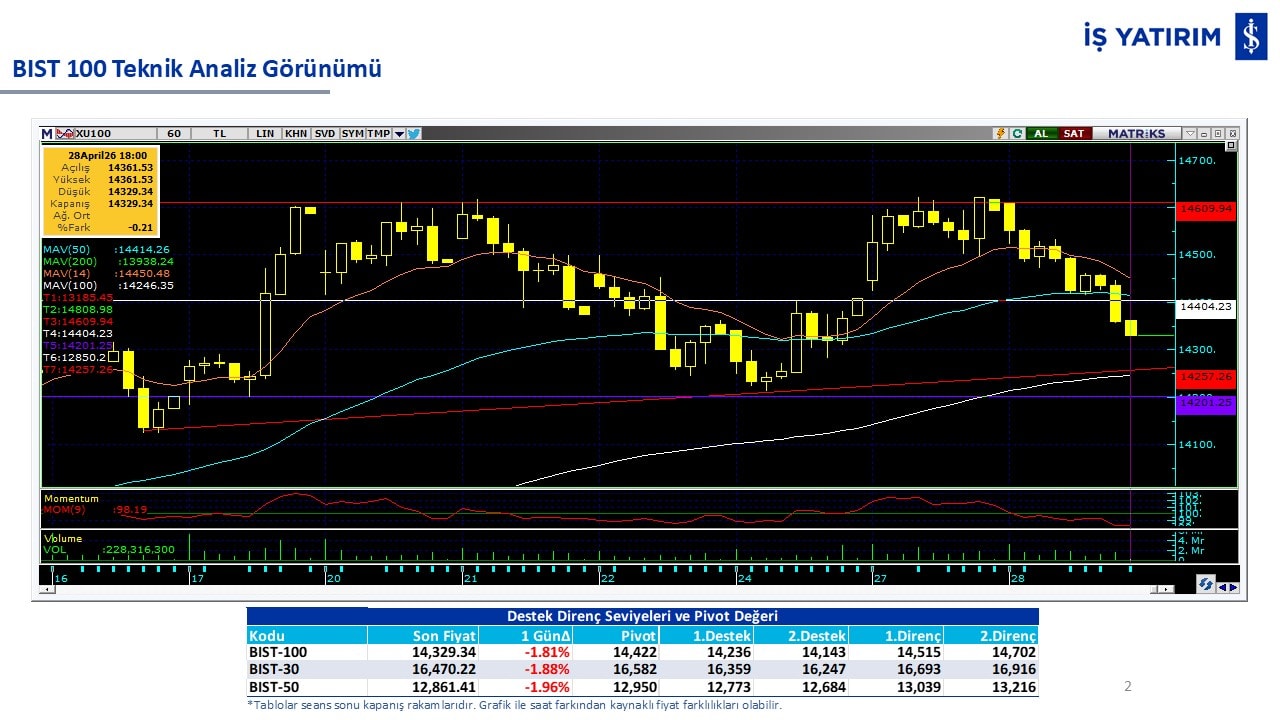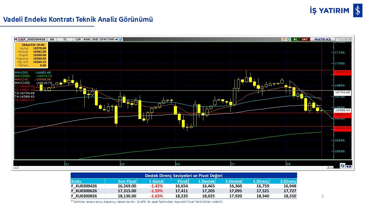 “Teknik Bülten” raporumuzun içeriğinde; Vadeli endeks, kur, BIST100 endeksi, temel analiz tarafında da öneri verdiğimiz 18 adet hissenin teknik destek/direnç seviyeleri ve buna baz teşkil eden teknik grafikleri, bugün piyasadan pozitif ayrışma ihtimali olan hisseler ve bunların teknik destek/direnç seviyeleri, piyasa rakamları, dün çok açığa satış yapılan hisse senetleri ve kısa vadeli işlem önerilerimizden son 10 tanesi yer almaktadır.
