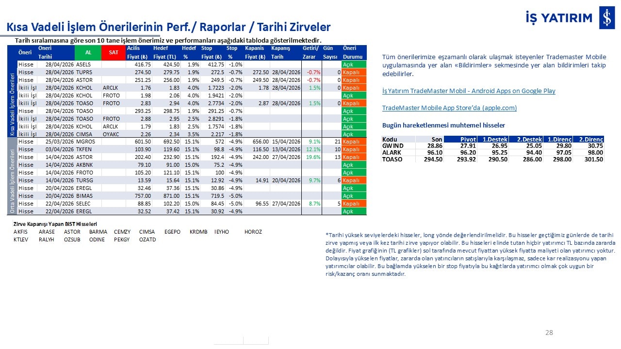 Kısa vadeli işlemlerimizin performanslarını ve tarihi zirve kapanışı yapan BIST hisselerini raporun son bölümünde görüntüleyebilirsiniz.